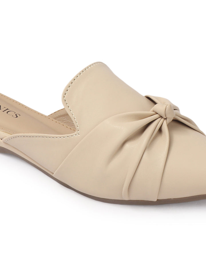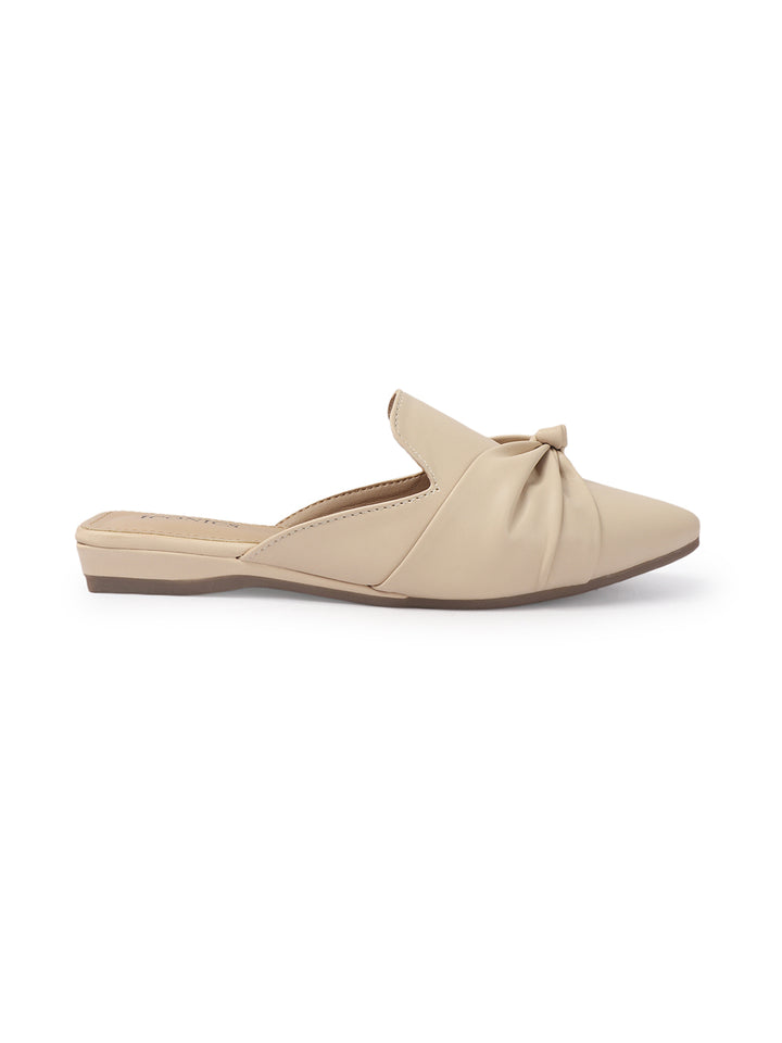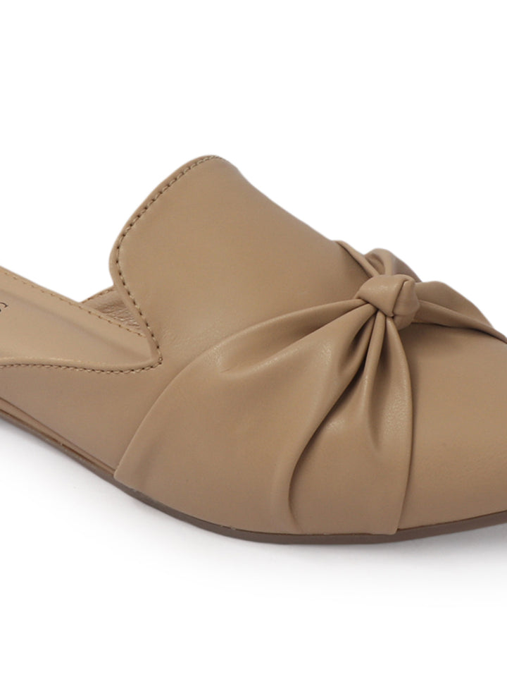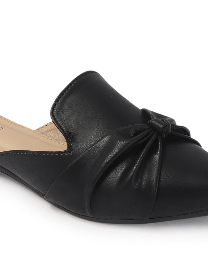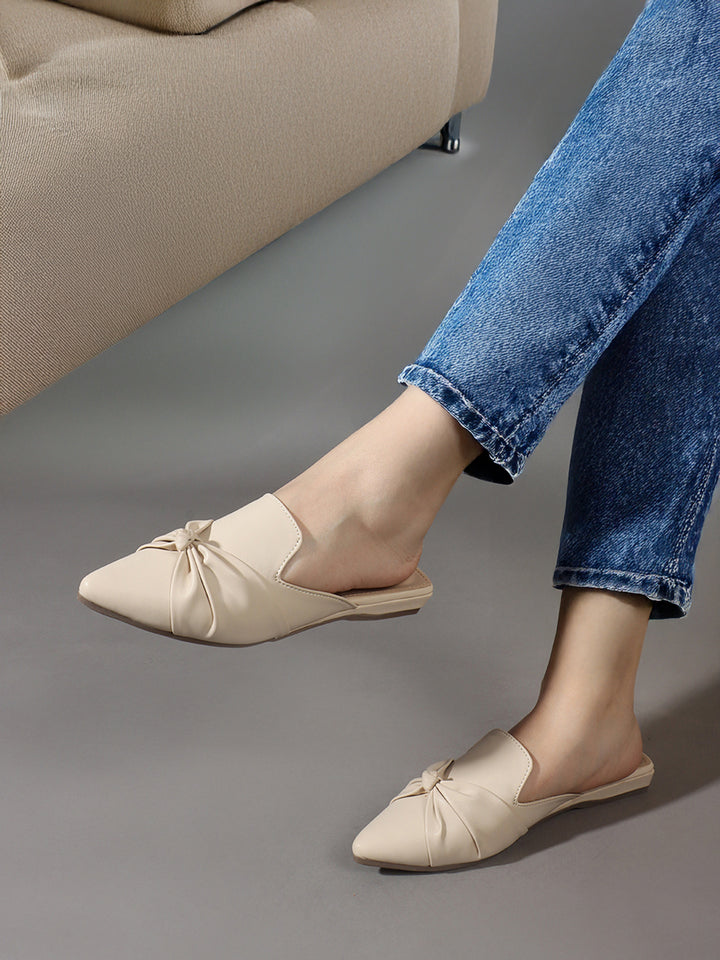 Step into effortless sophistication with this elegant pointed-toe knotted flat mule. This chic slip-on shoe instantly elevates your ensemble with its graceful gathered and knotted detail adorning the vamp, adding a touch of refined texture. The classic pointed toe silhouette creates a polished look that flatters the foot. Designed for convenience and comfort, the backless mule style allows for easy on and off, while the lightweight, flexible flat sole ensures comfortable wear throughout your day. Perfectly versatile, this mule is an essential addition to your wardrobe, ideal for office attire, weekend outings, or smart casual events.