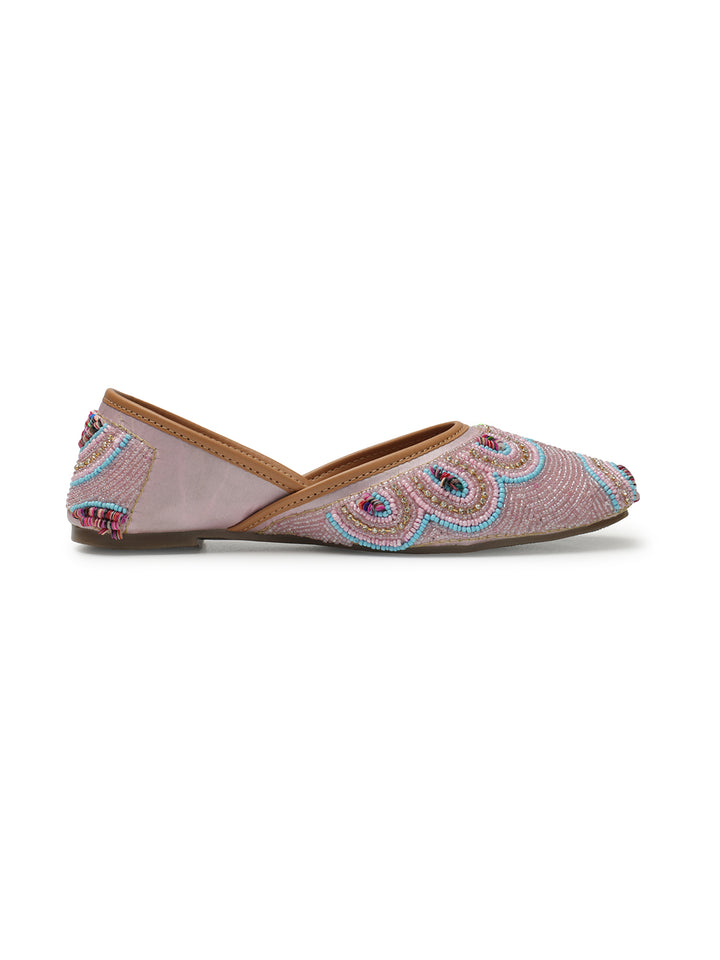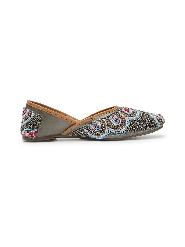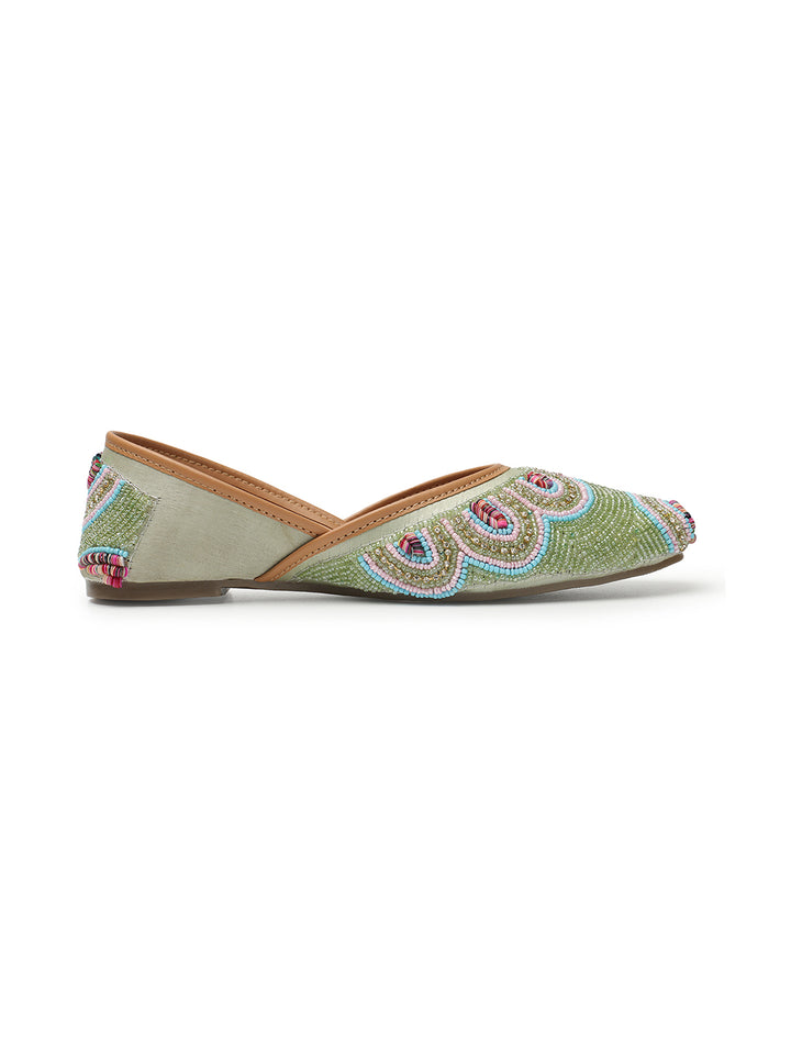 Step into a world of vibrant artistry with these handcrafted Artisan Beaded Juttis. These traditional Indian slip-on flats are a celebration of meticulous craftsmanship, featuring an enchanting all-over beaded pattern that creates striking scalloped and concentric designs across the upper. The rich tapestry of beads in varying hues forms a beautiful, textured mosaic that truly stands out.
