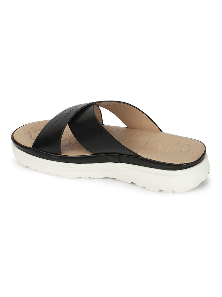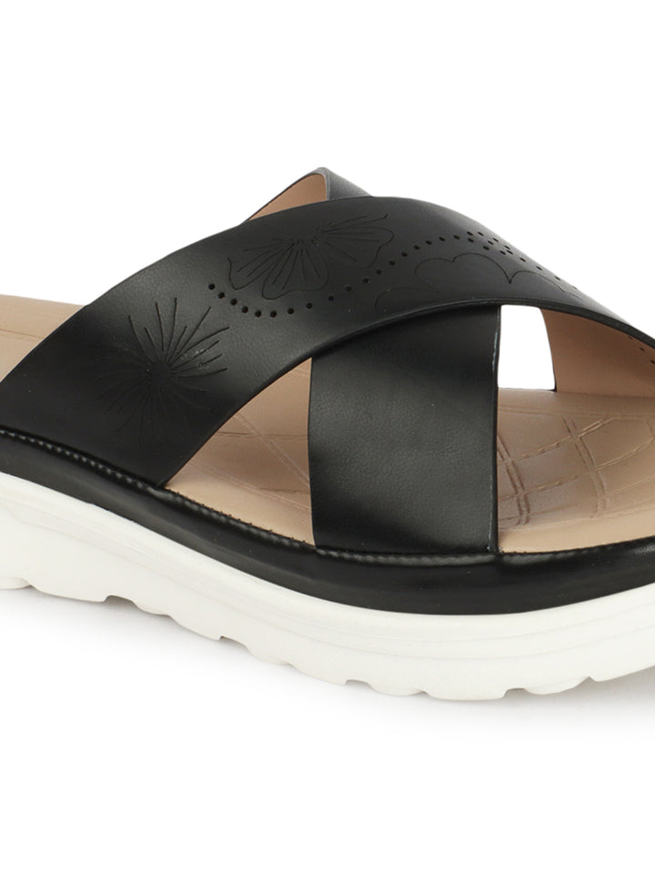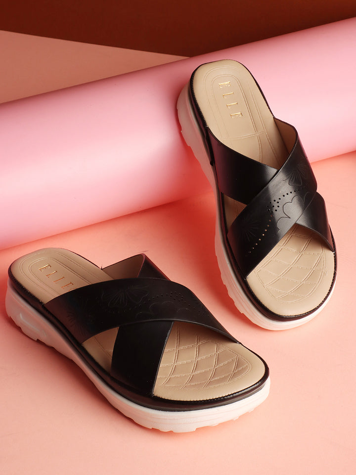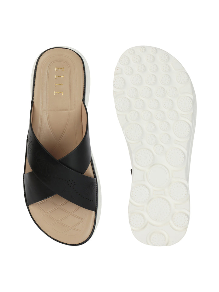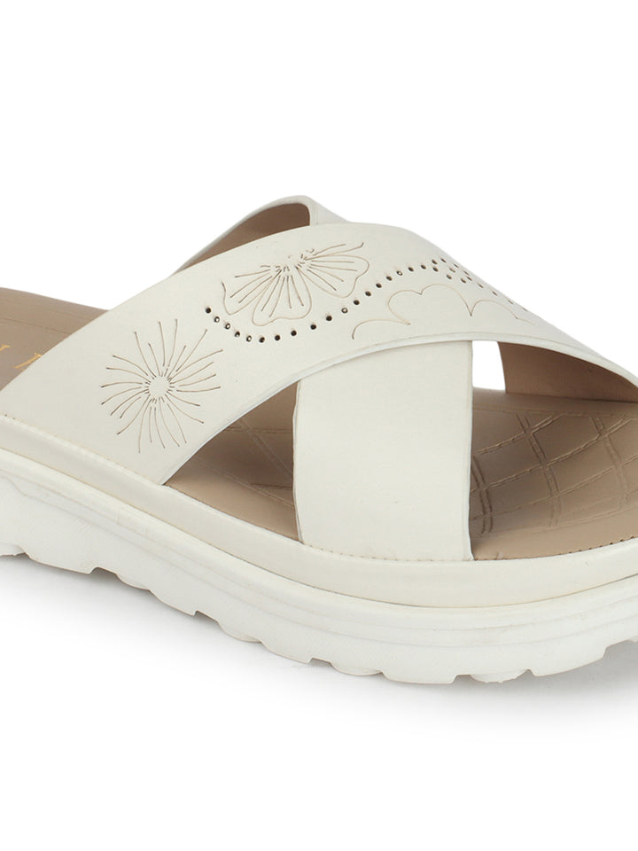 Step into effortless style and comfort with these chic slide sandals. Featuring wide, crisscross straps with delicate perforated detailing, these sandals offer a modern and feminine touch. The cushioned footbed ensures a comfortable stride, while the lightweight platform sole provides subtle elevation and reliable support. Perfect for casual wear, these versatile slides are ideal for warm-weather days and relaxed occasions.