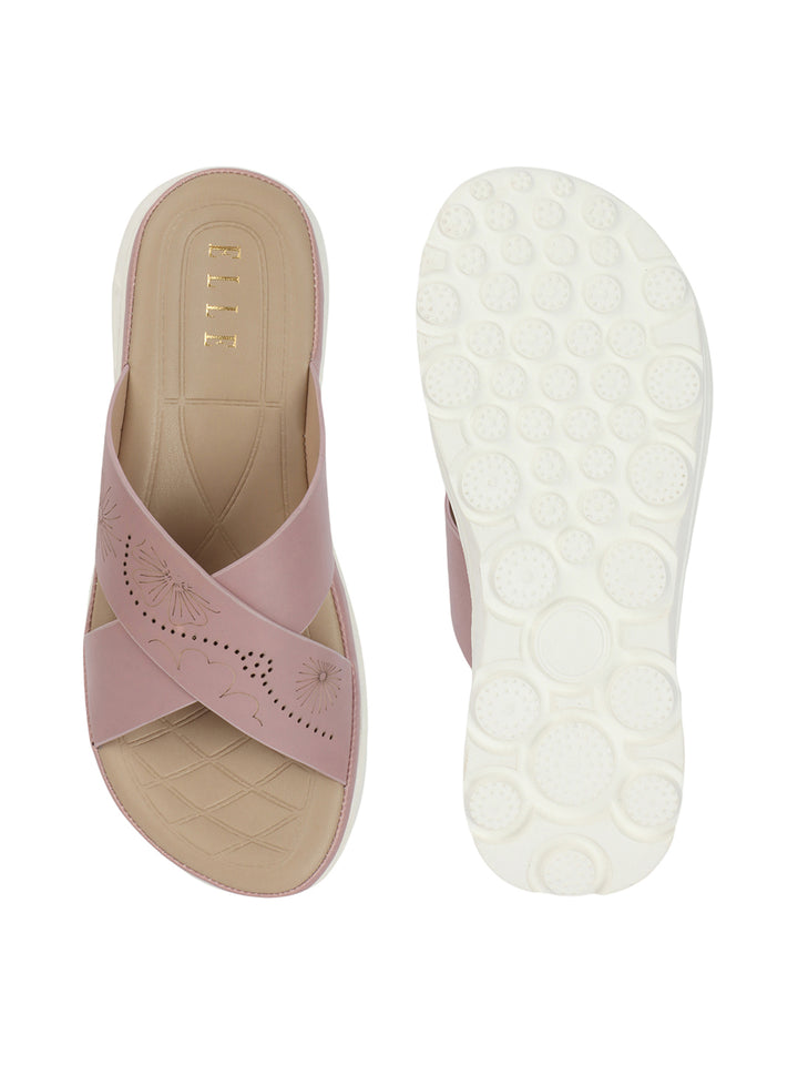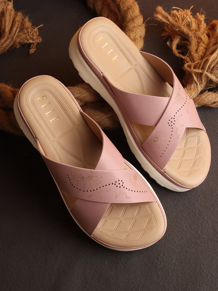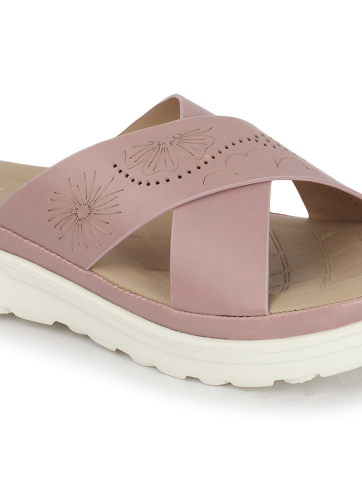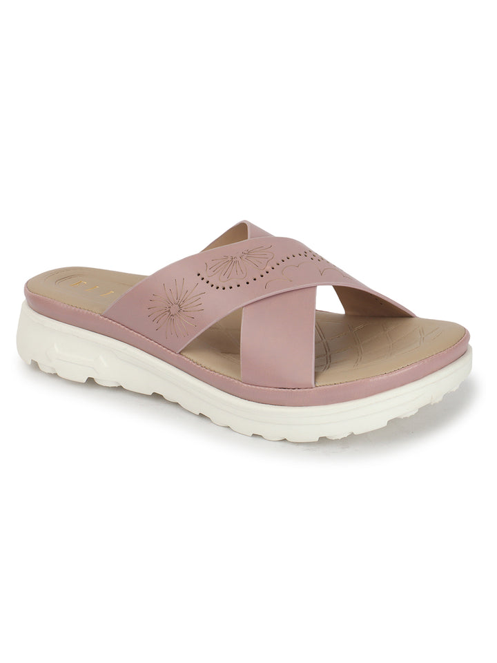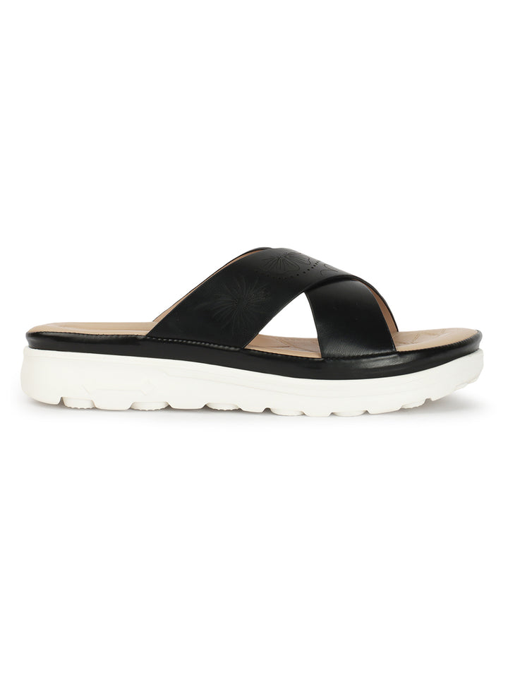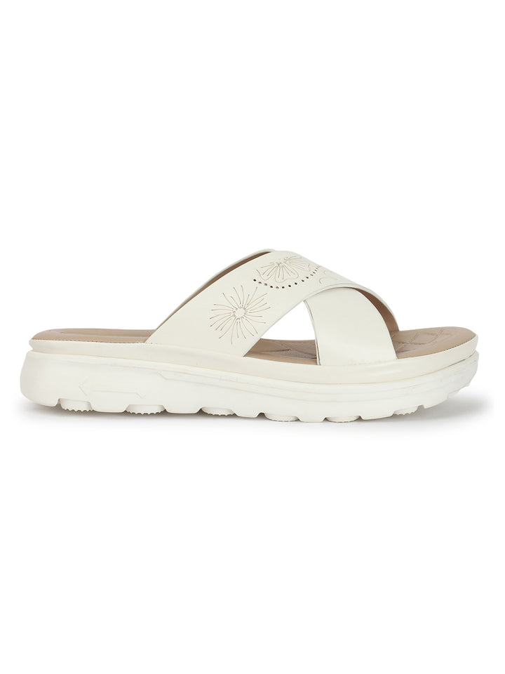 Step into effortless style and comfort with these chic slide sandals. Featuring wide, crisscross straps with delicate perforated detailing, these sandals offer a modern and feminine touch. The cushioned footbed ensures a comfortable stride, while the lightweight platform sole provides subtle elevation and reliable support. Perfect for casual wear, these versatile slides are ideal for warm-weather days and relaxed occasions.