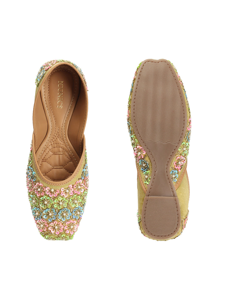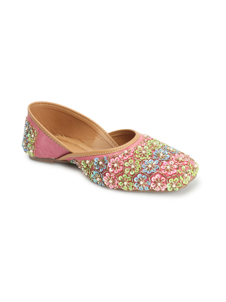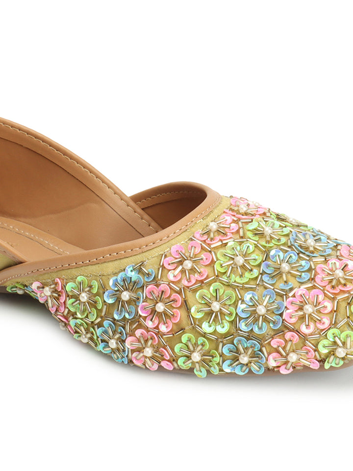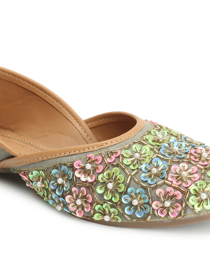 Add a playful, sophisticated sparkle to your traditional attire with these eye-catching hand-embroidered flat juttis. The classic closed-toe silhouette is completely covered in a dense, charming floral pattern, meticulously crafted using shimmering colorful sequins and delicate faux pearls. Built on a comfortable flat sole and featuring a soft interior lining, these shoes offer both style and all-day comfort. Perfect for festive occasions, wedding ceremonies, or pairing with an elegant Kurti, these embellished flats are a vibrant statement piece that celebrates traditional artistry.