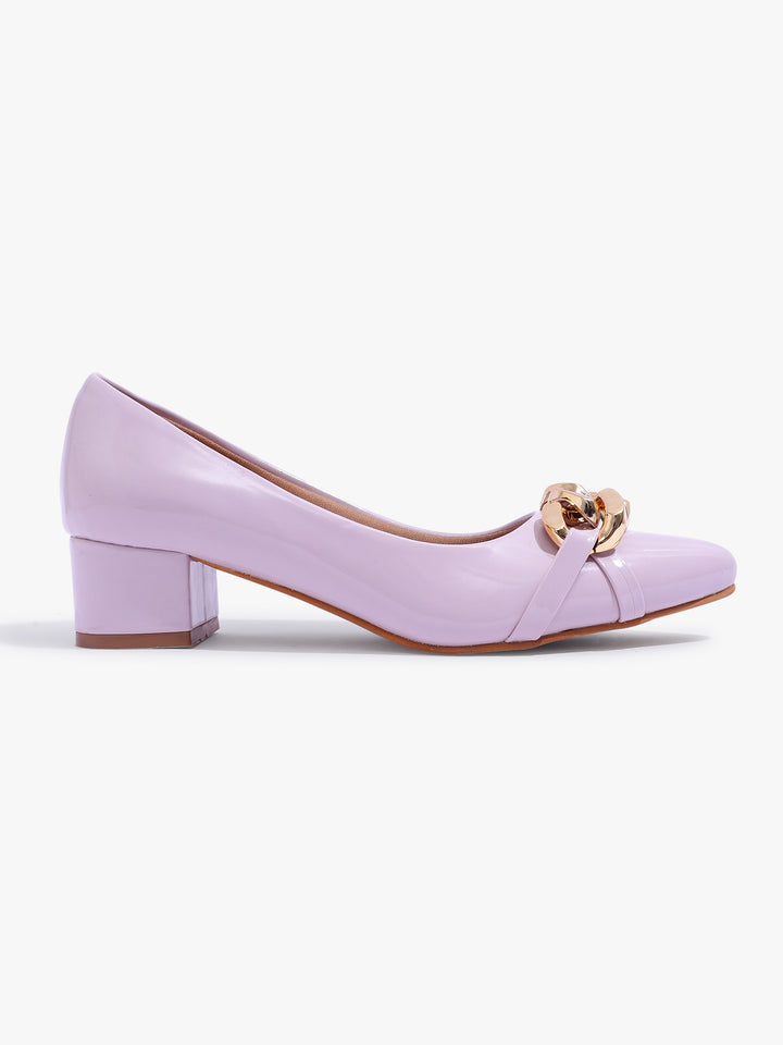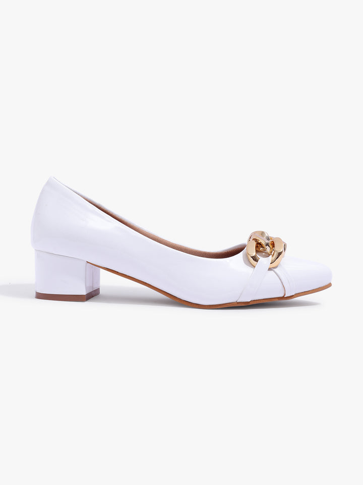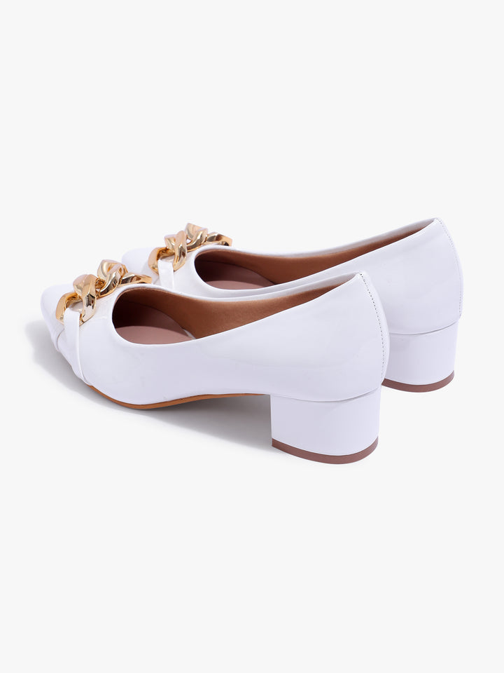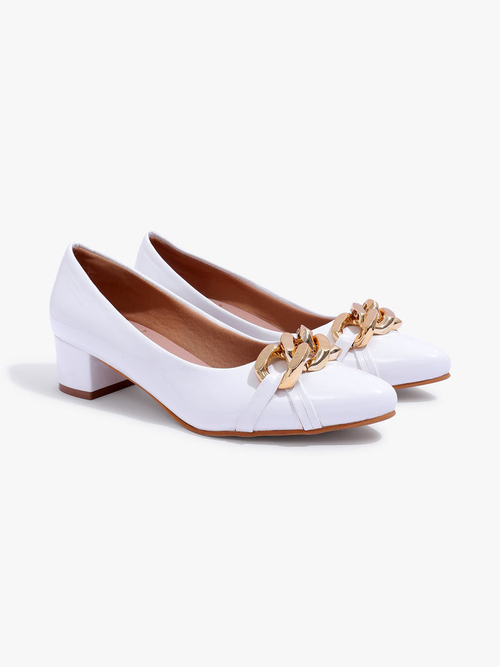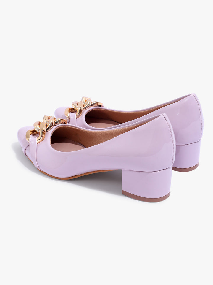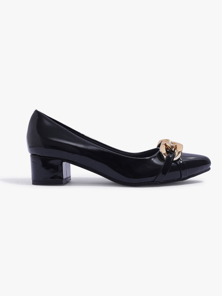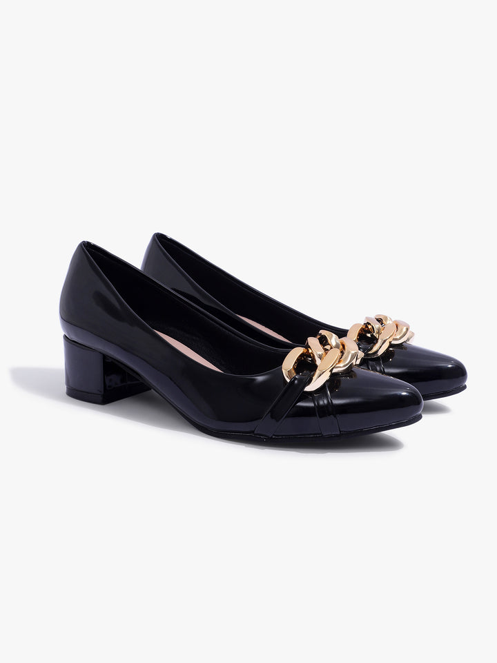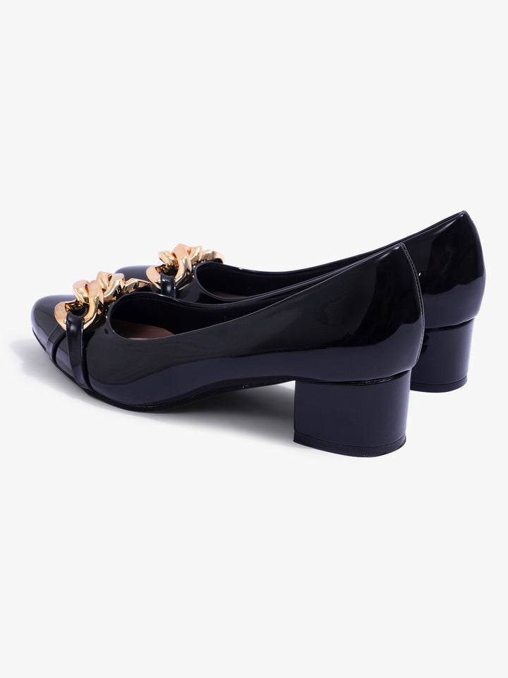 Women's Glossy Block Heel Pumps with Chain Detail