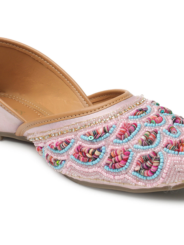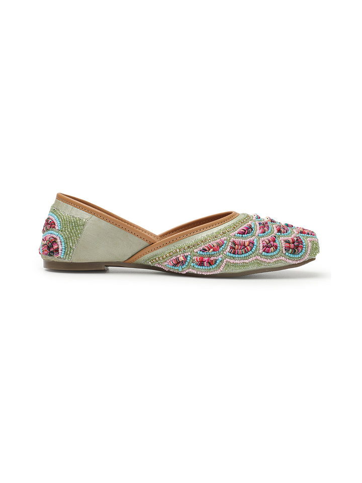 Step into a world of intricate beauty with these stunning Ethnic Juttis, a true work of art for your feet. Handcrafted with extraordinary detail, these slip-on flats showcase an exquisite all-over beaded design forming a captivating scalloped or fan-like pattern. Each bead is meticulously placed to create a rich texture and a mesmerizing visual effect.