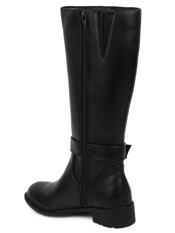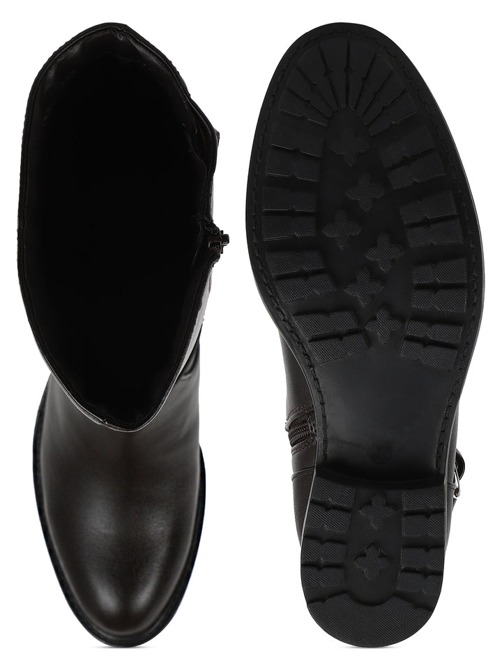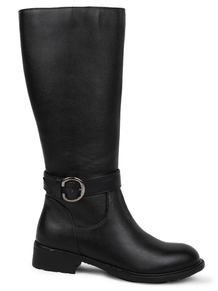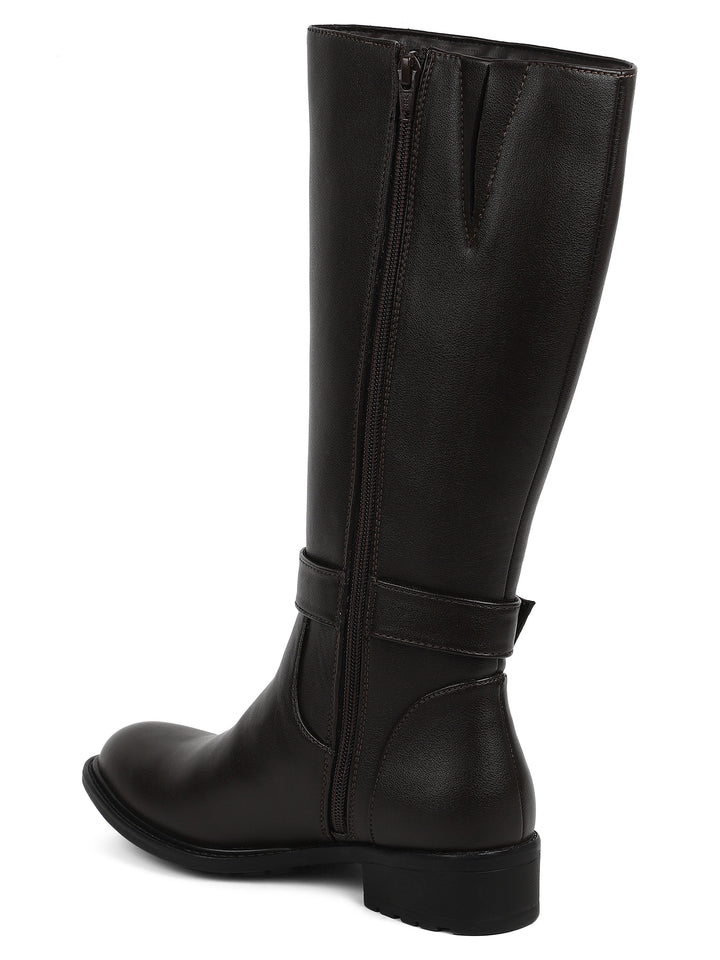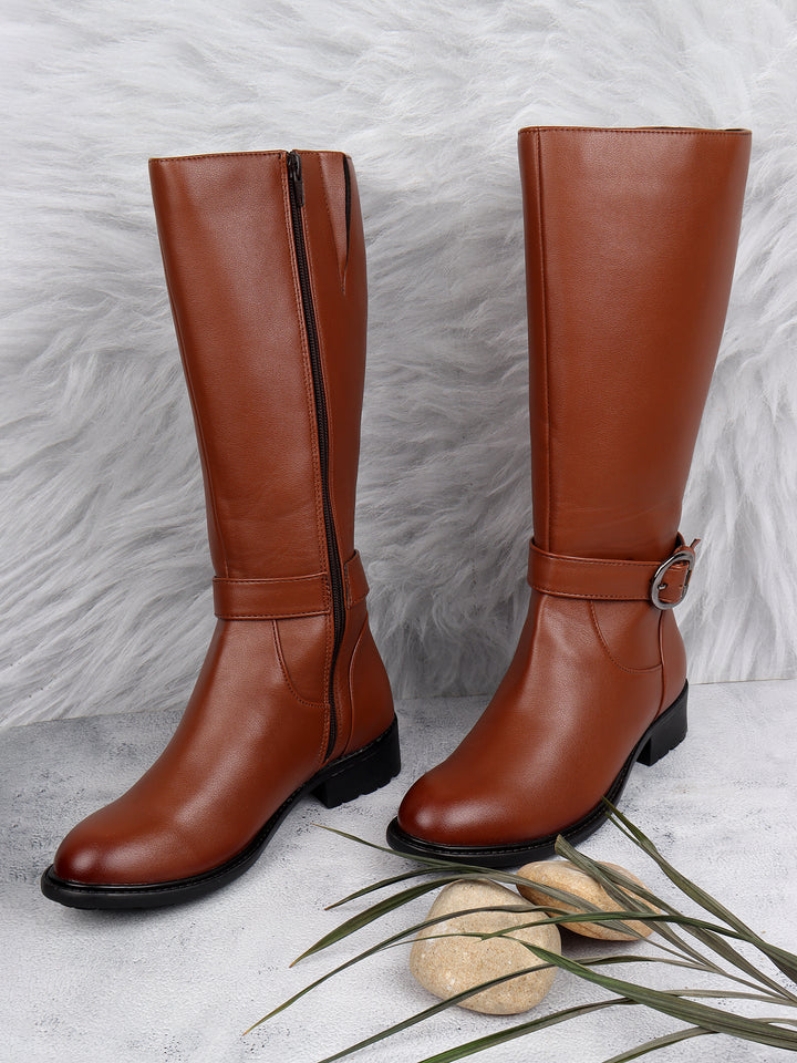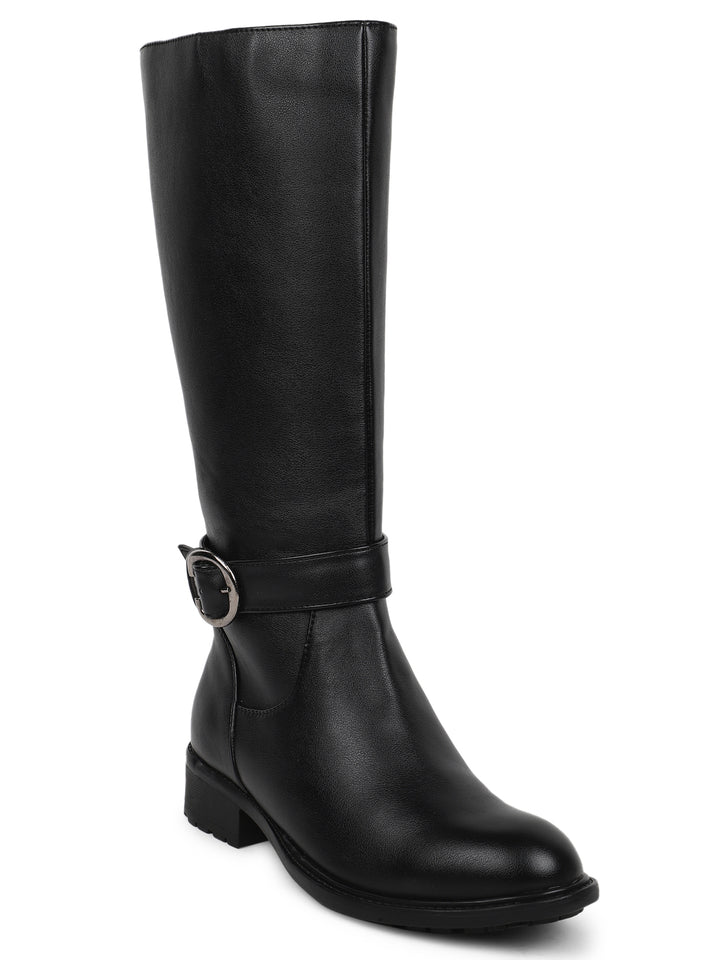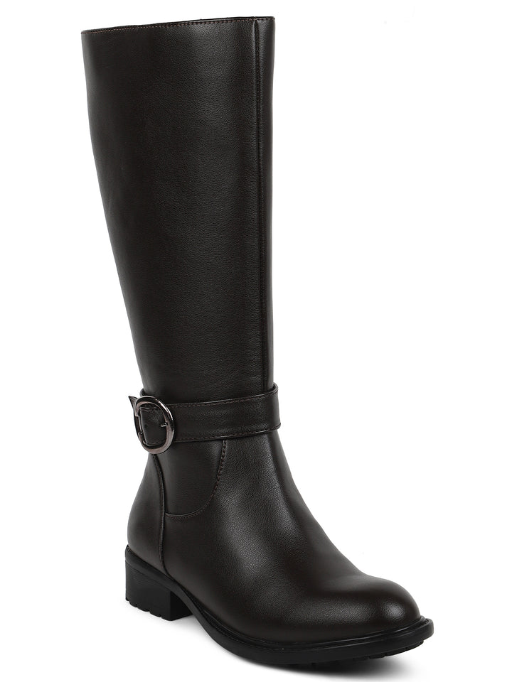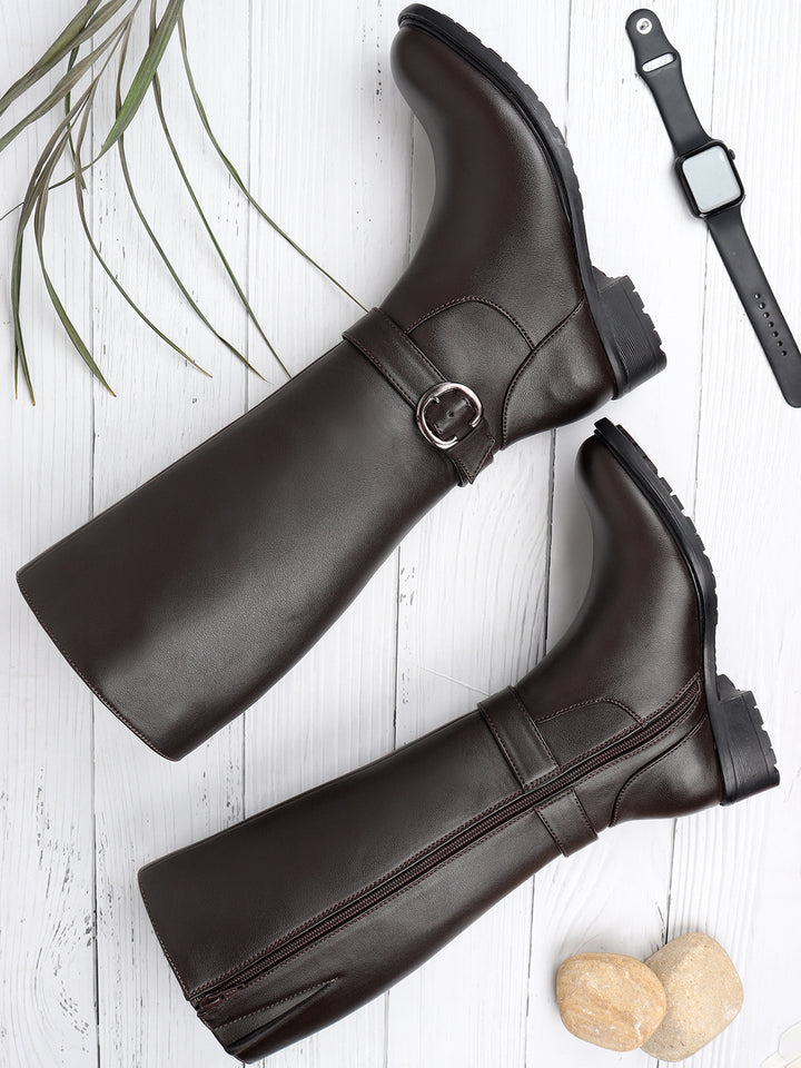 Step out in sophisticated style with these elegant women's knee-high riding boots. The classic silhouette is elevated by a sleek strap with a polished buckle detail, adding a touch of modern flair. A convenient side zipper allows for easy on and off, while the low block heel provides a comfortable and stable lift for all-day wear. The durable sole offers reliable traction, making them a versatile choice for a variety of occasions. Perfect for pairing with leggings, jeans, or dresses, these boots are a timeless and essential addition to your cold-weather wardrobe.