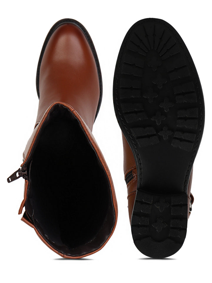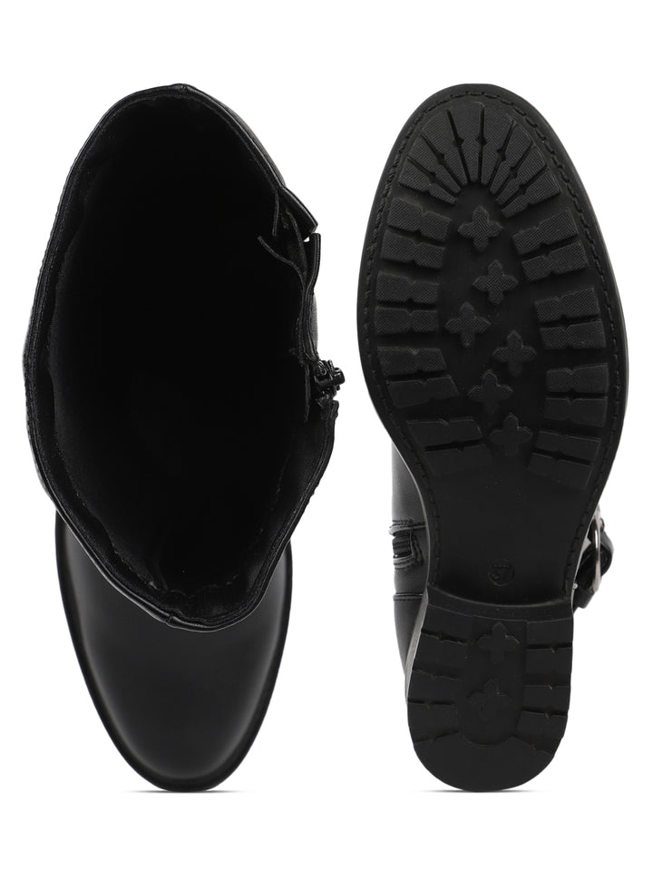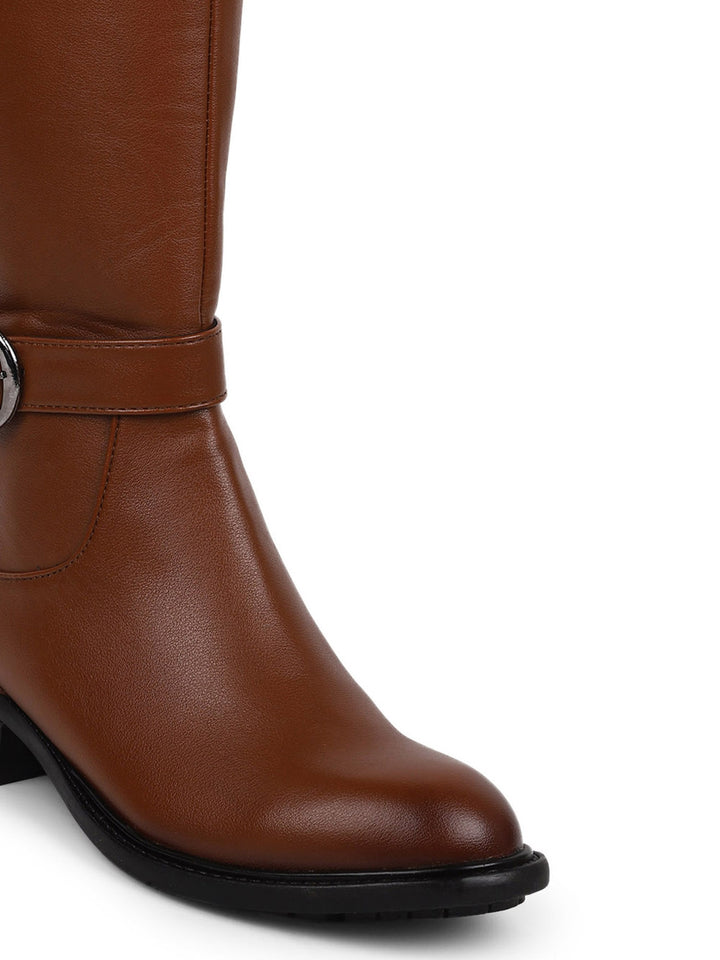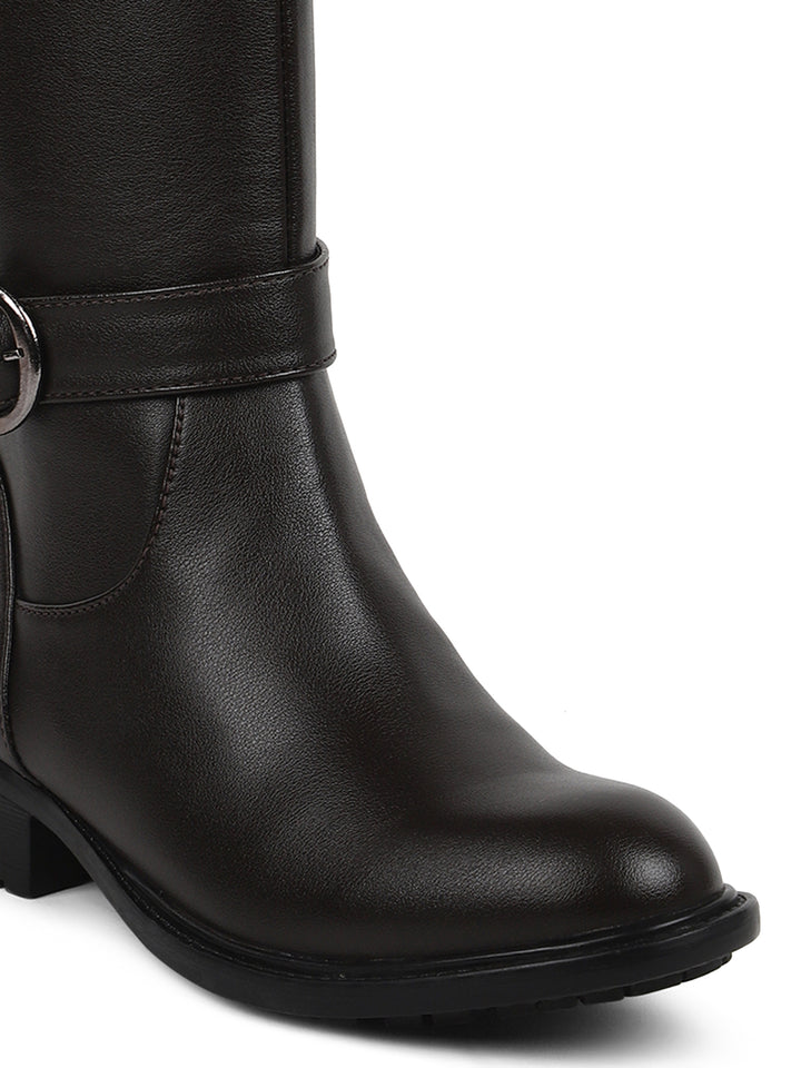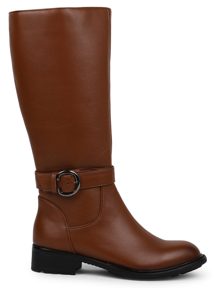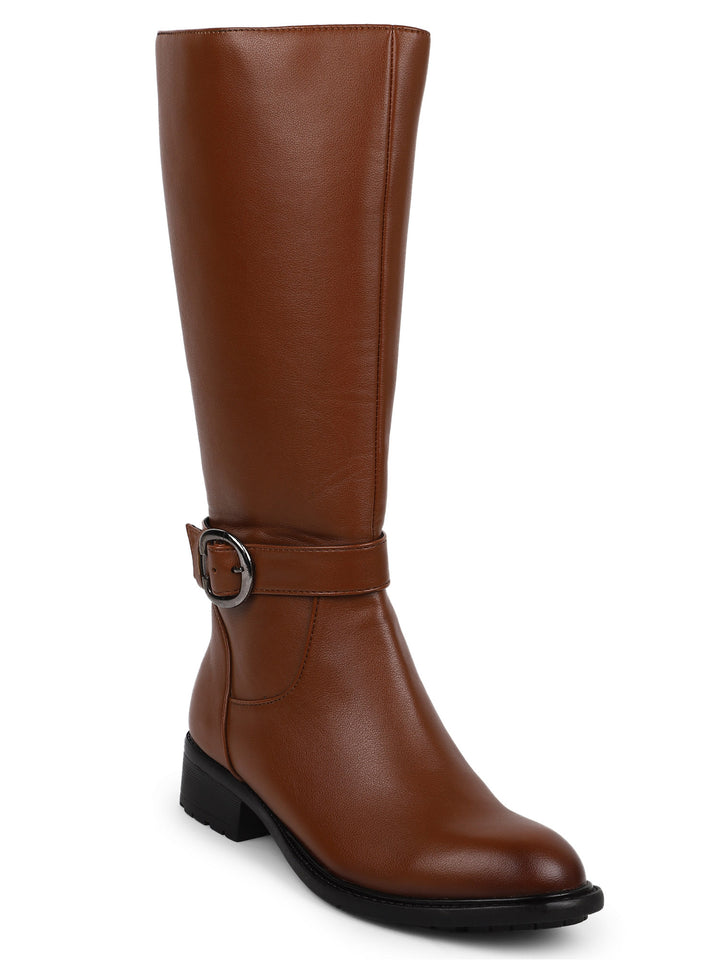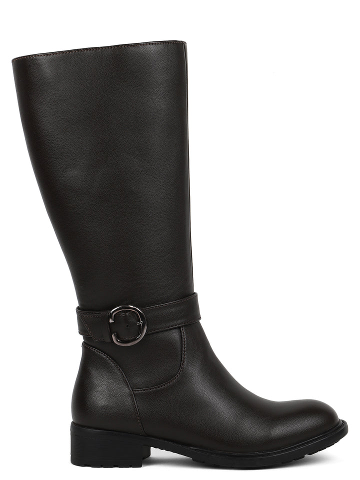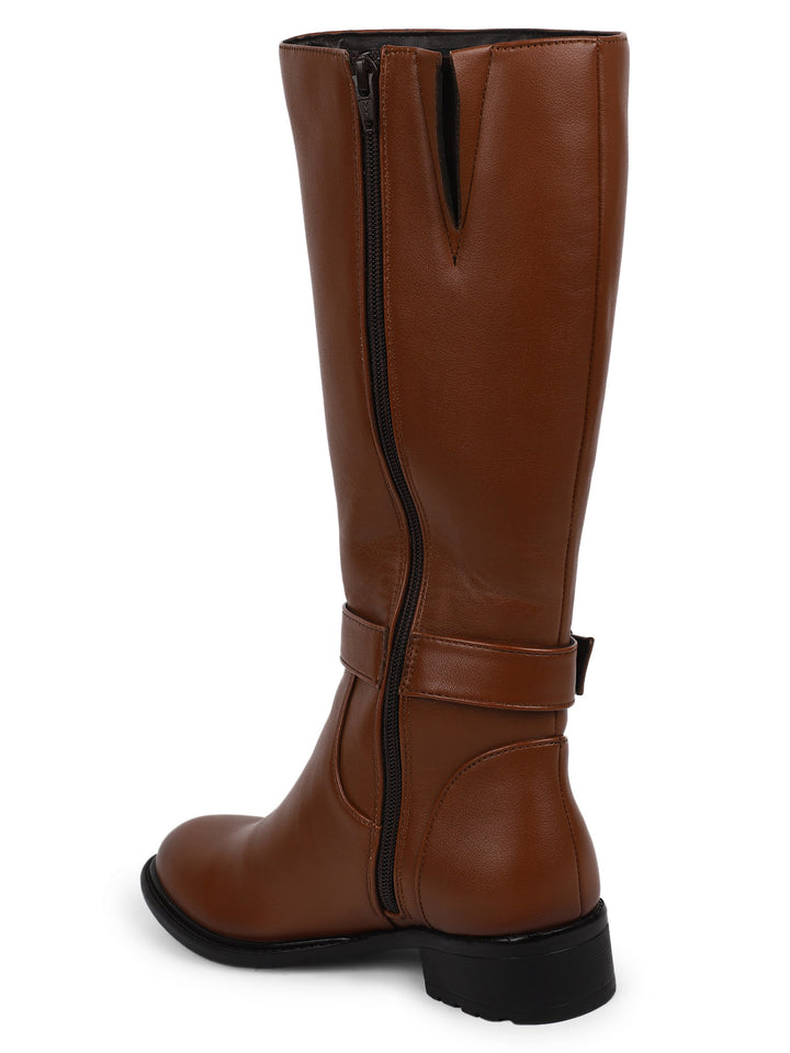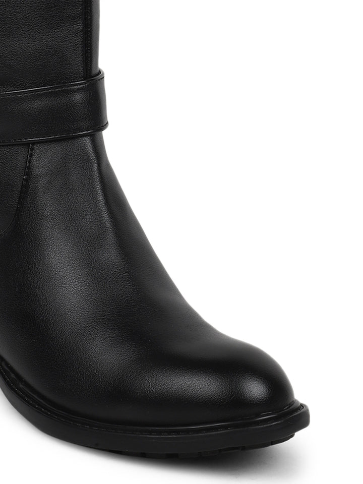 Step out in sophisticated style with these elegant women's knee-high riding boots. The classic silhouette is elevated by a sleek strap with a polished buckle detail, adding a touch of modern flair. A convenient side zipper allows for easy on and off, while the low block heel provides a comfortable and stable lift for all-day wear. The durable sole offers reliable traction, making them a versatile choice for a variety of occasions. Perfect for pairing with leggings, jeans, or dresses, these boots are a timeless and essential addition to your cold-weather wardrobe.