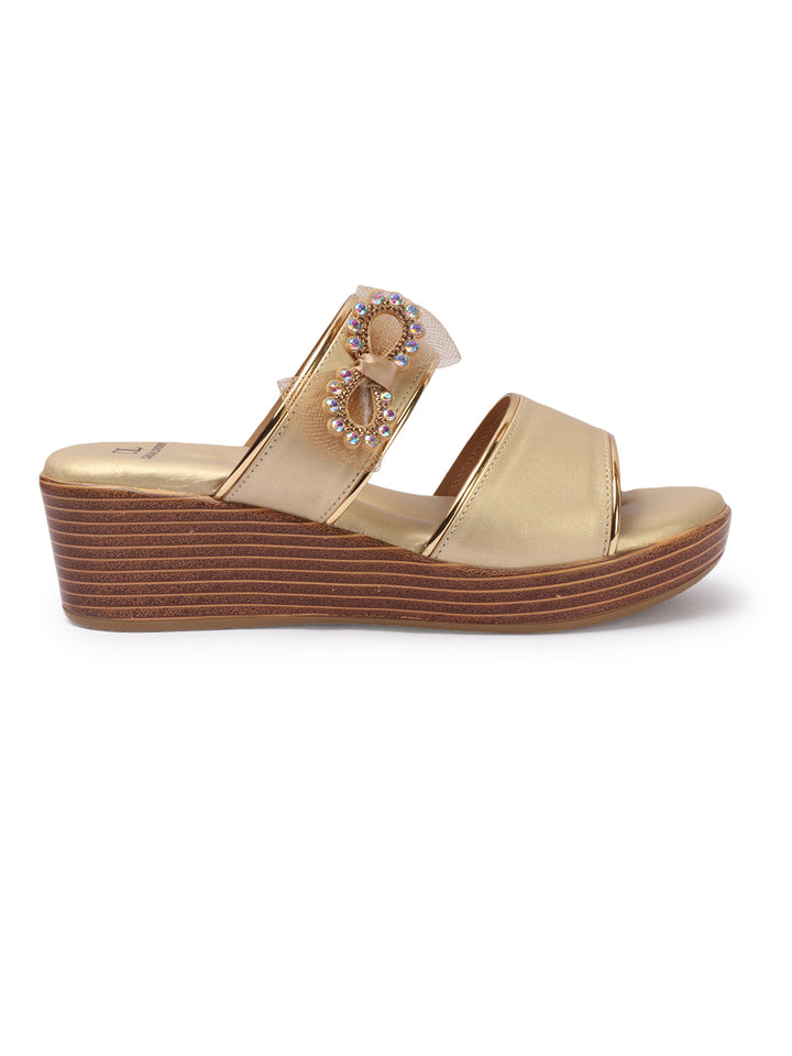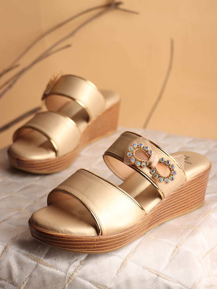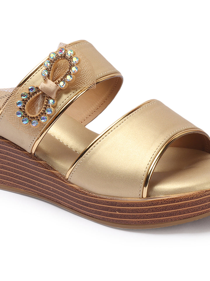 Step into sparkling style and comfort with these Women's Metallic Gold Embellished Wedge Sandals Women's Designed for a fashionable yet relaxed look, these footwear The comfortable Perfect for warm weather, these versatile are ideal for casual outings, special events, or simply adding a touch to your everyday look.
