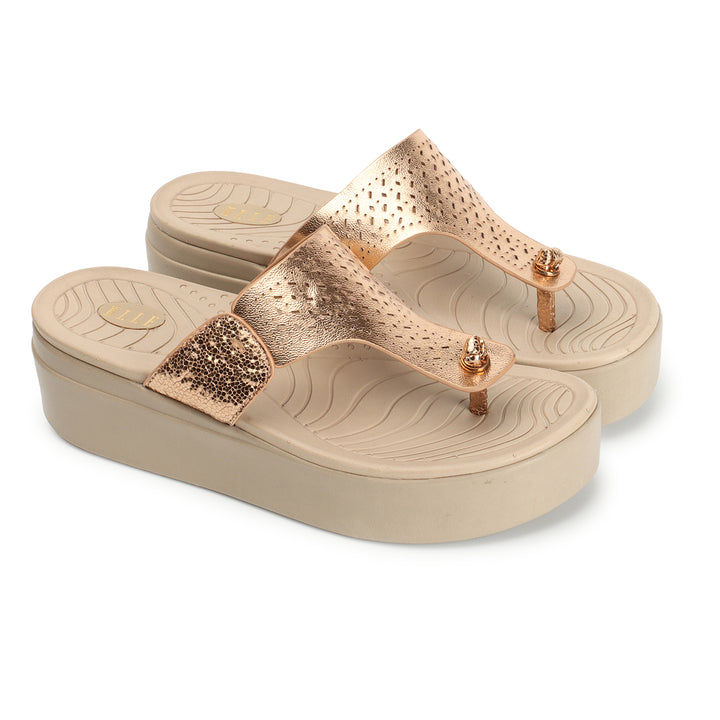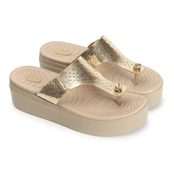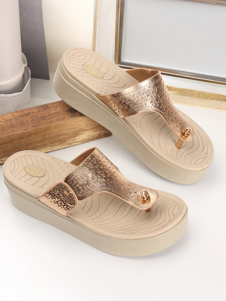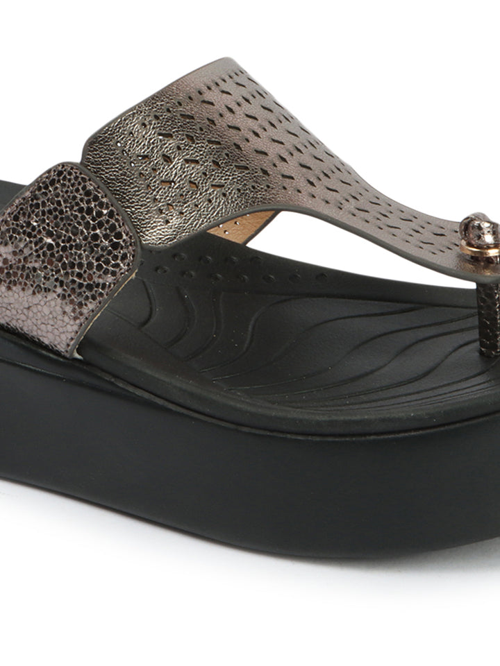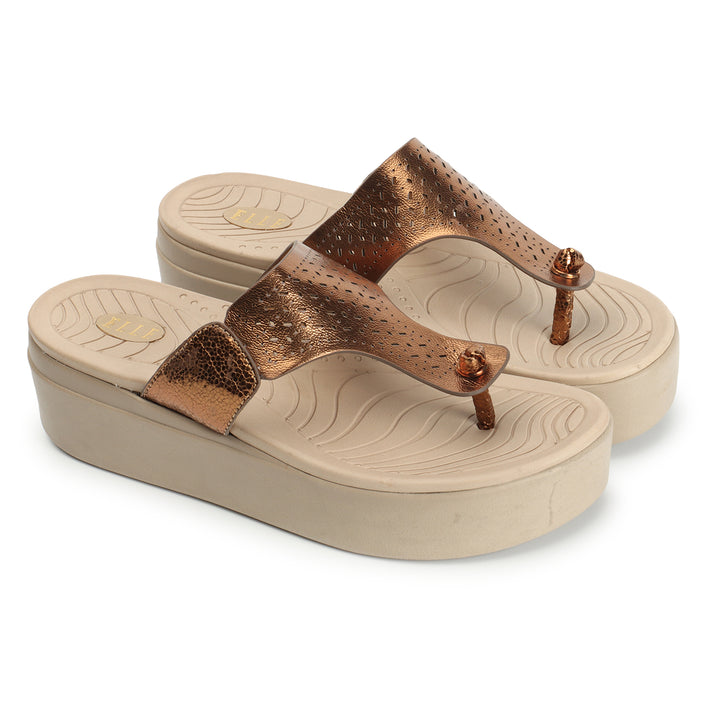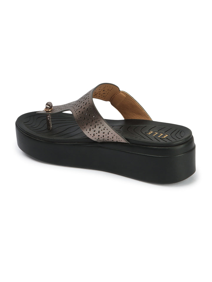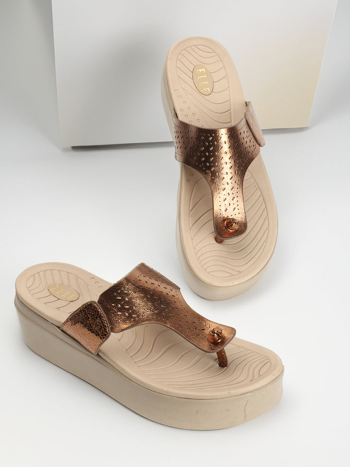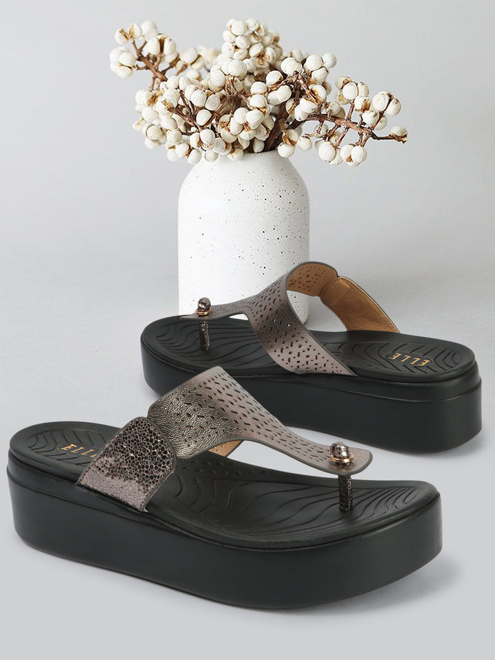 Step into elevated style with these fashionable women's platform sandals. The unique thong strap features a chic perforated design with a striking metallic finish, adding a modern and eye-catching touch. The comfortable platform wedge provides a gentle lift and a cushioned footbed for a stable and pleasant stride, making them ideal for all-day wear. Perfect for casual outings and warm-weather days, these slip-on sandals combine fashion-forward style with laid-back ease.
