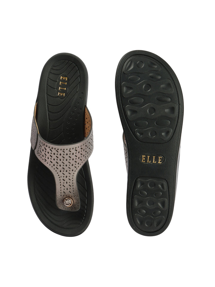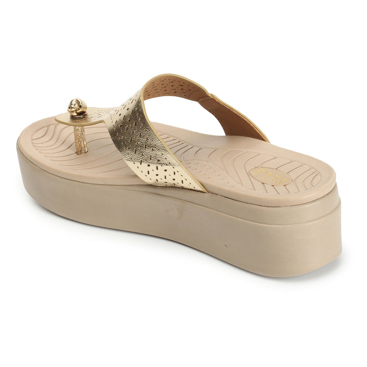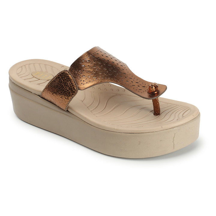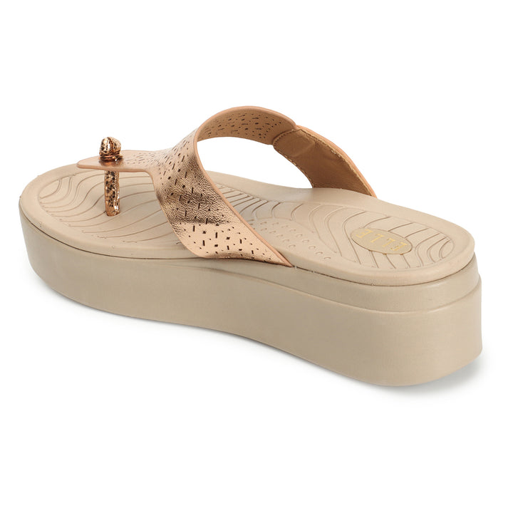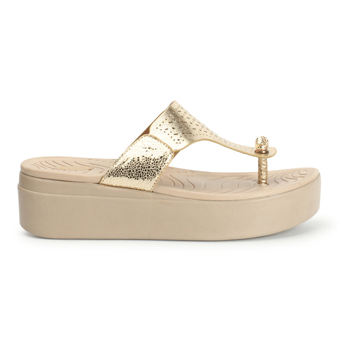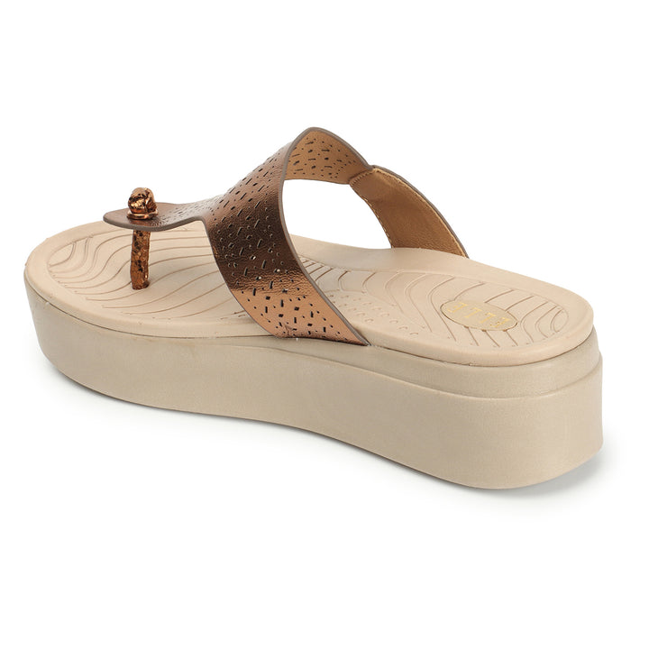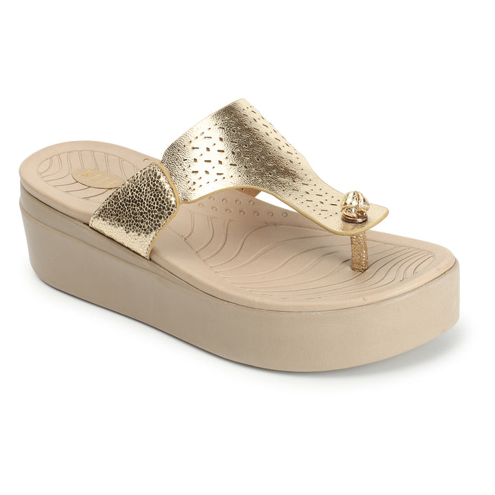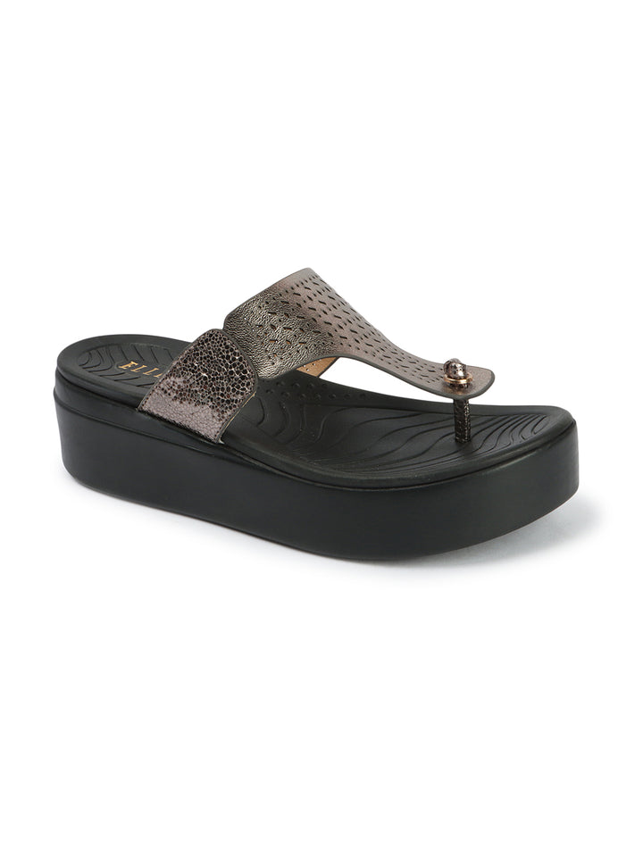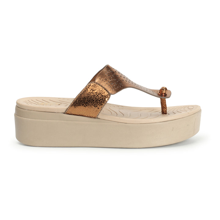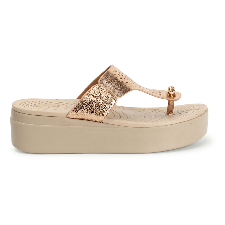 Step into elevated style with these fashionable women's platform sandals. The unique thong strap features a chic perforated design with a striking metallic finish, adding a modern and eye-catching touch. The comfortable platform wedge provides a gentle lift and a cushioned footbed for a stable and pleasant stride, making them ideal for all-day wear. Perfect for casual outings and warm-weather days, these slip-on sandals combine fashion-forward style with laid-back ease.