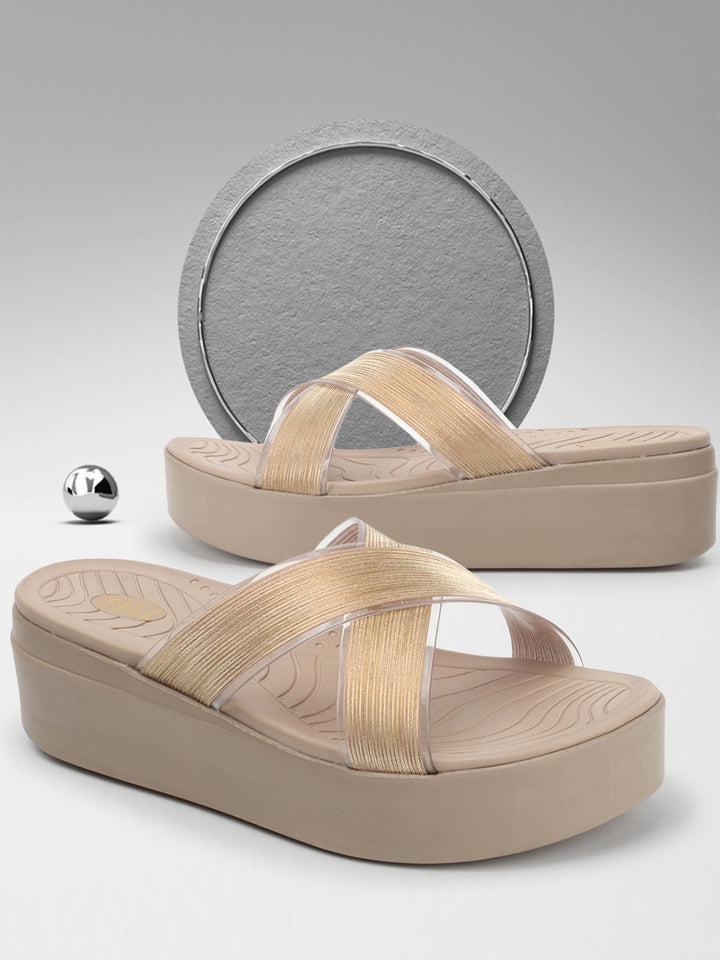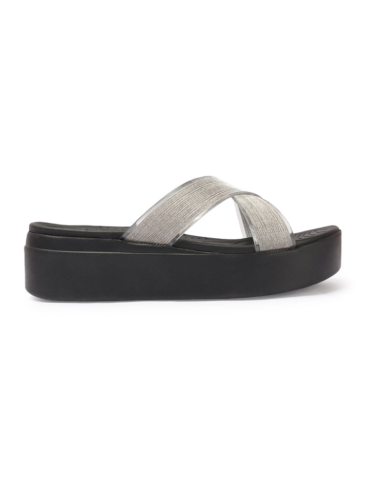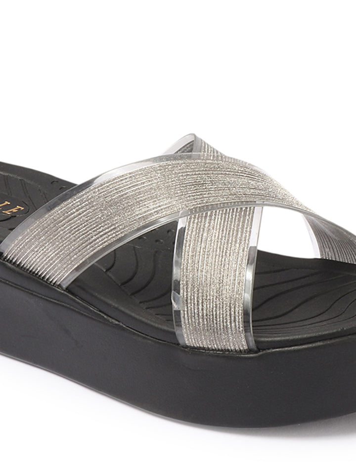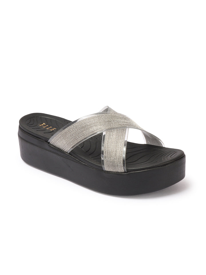 Step into a world of comfort and glamour with these stylish platform slides. These sandals feature a platform wedge sole that provides a comfortable lift and stable support. The upper is designed with a unique crisscross strap pattern, where one strap is a clear band and the other is a wide strap crafted from a shimmering, textured thread. This combination creates an eye-catching and modern look. The slip-on design offers effortless convenience, while the cushioned and contoured footbed ensures all-day comfort. Perfect for elevating your casual ensembles, these slides are a versatile and chic addition to your footwear collection.
