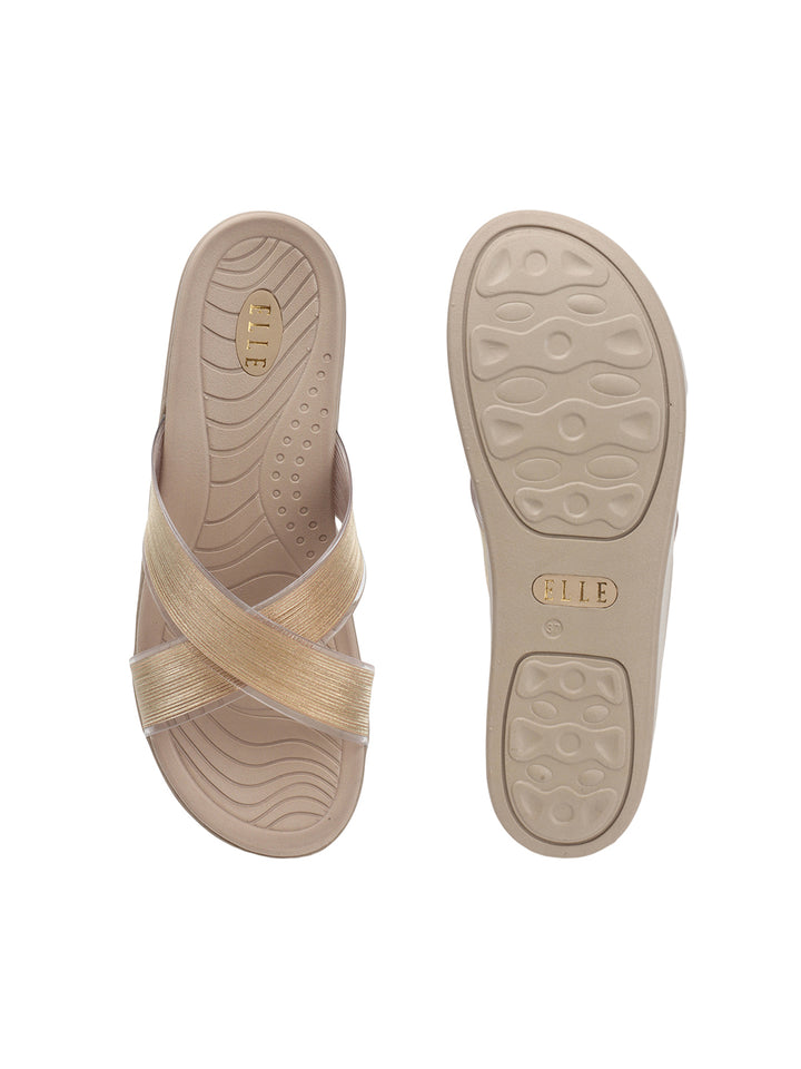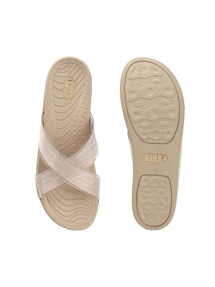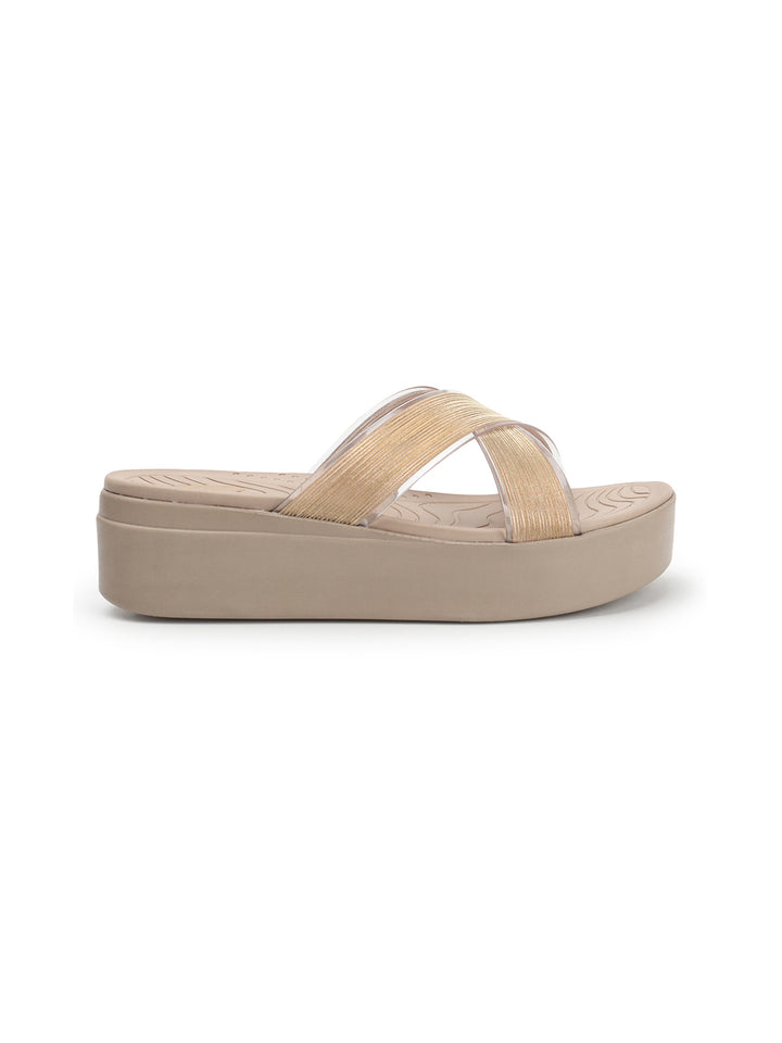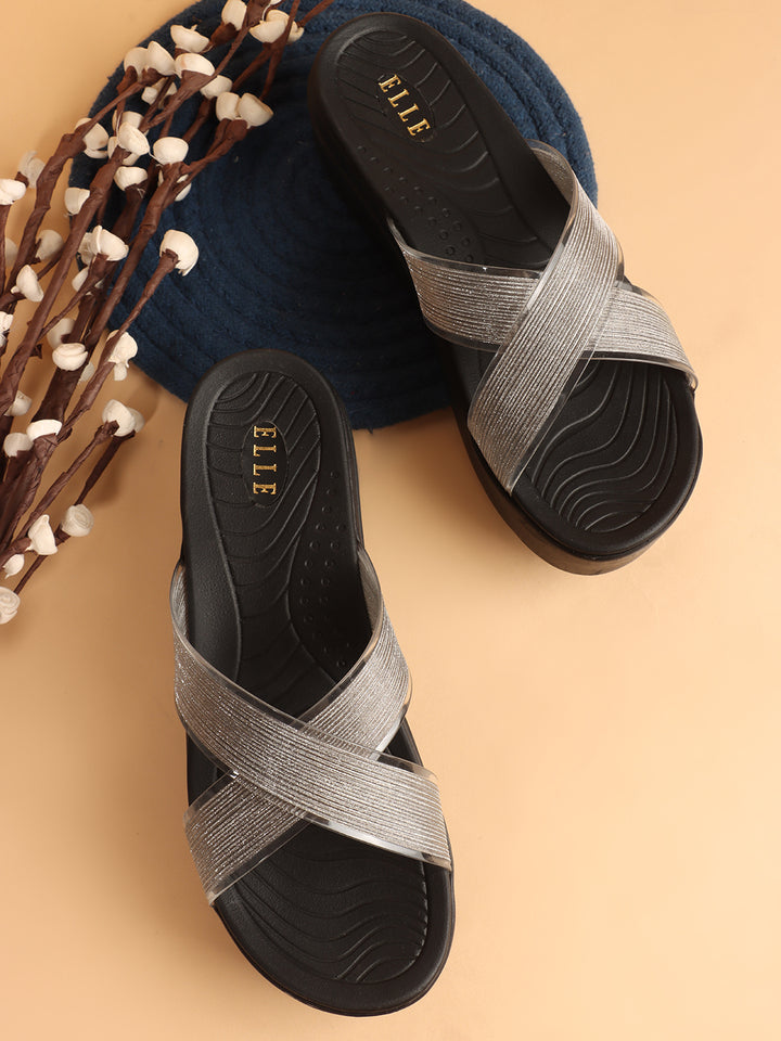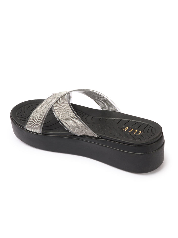 Step into a world of comfort and glamour with these stylish platform slides. These sandals feature a platform wedge sole that provides a comfortable lift and stable support. The upper is designed with a unique crisscross strap pattern, where one strap is a clear band and the other is a wide strap crafted from a shimmering, textured thread. This combination creates an eye-catching and modern look. The slip-on design offers effortless convenience, while the cushioned and contoured footbed ensures all-day comfort. Perfect for elevating your casual ensembles, these slides are a versatile and chic addition to your footwear collection.