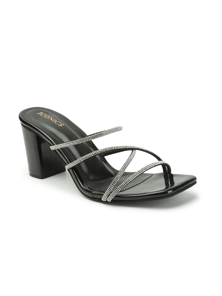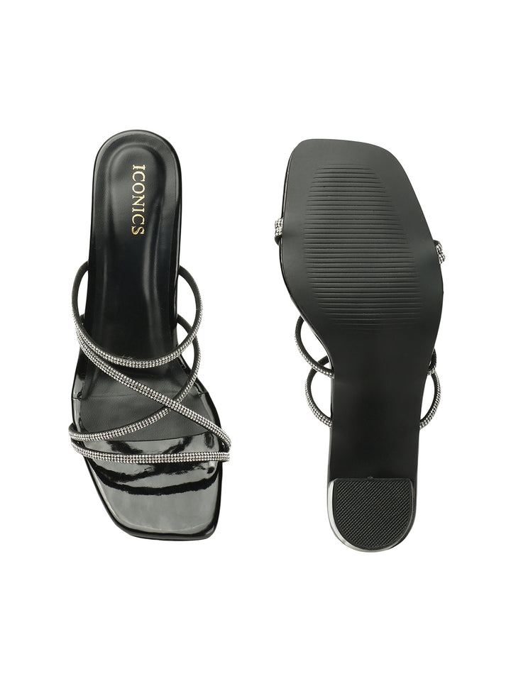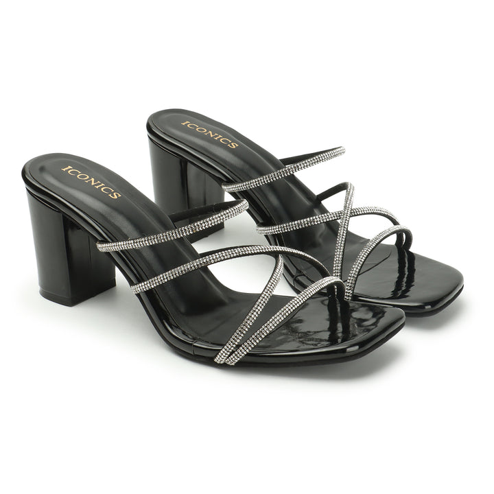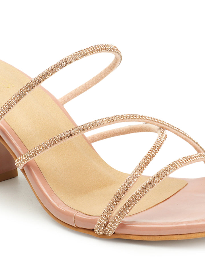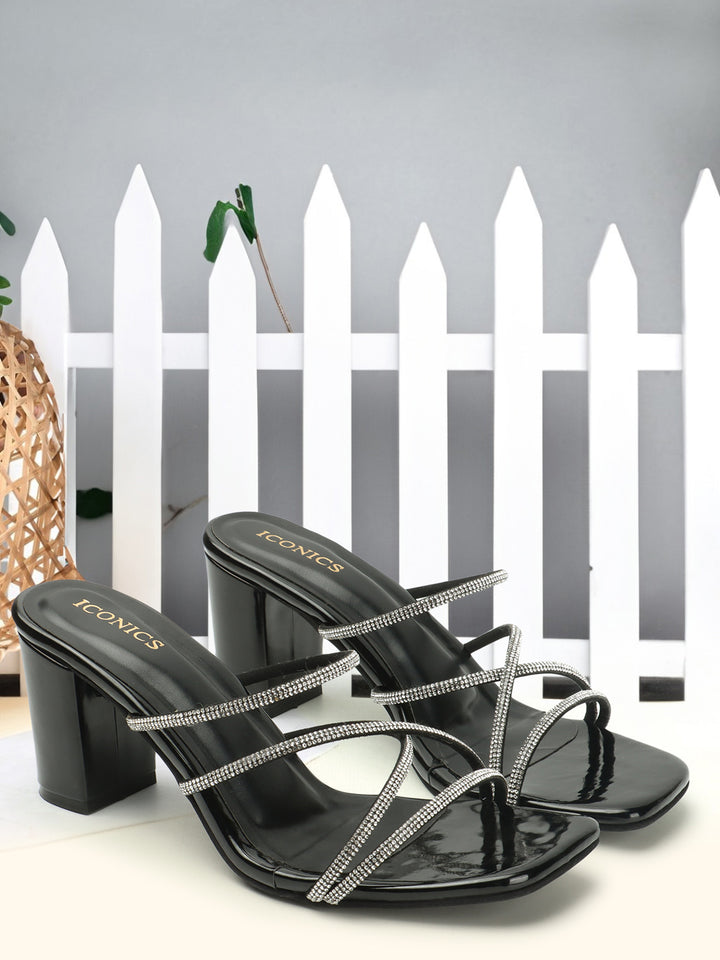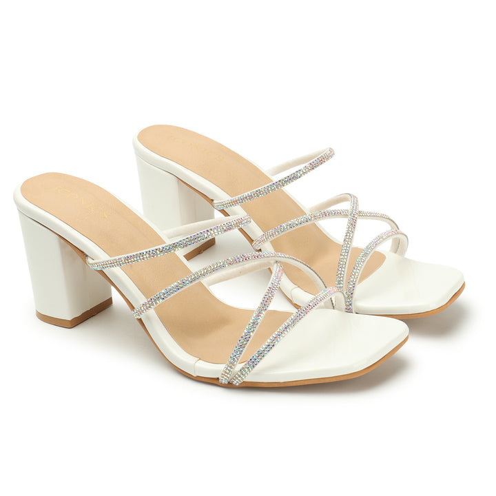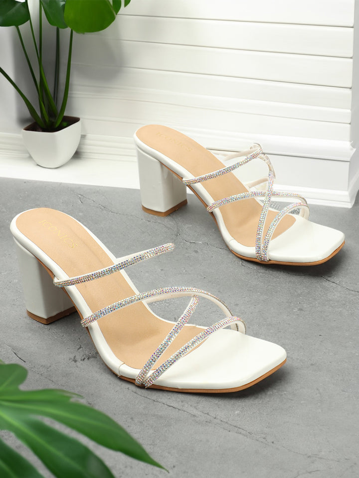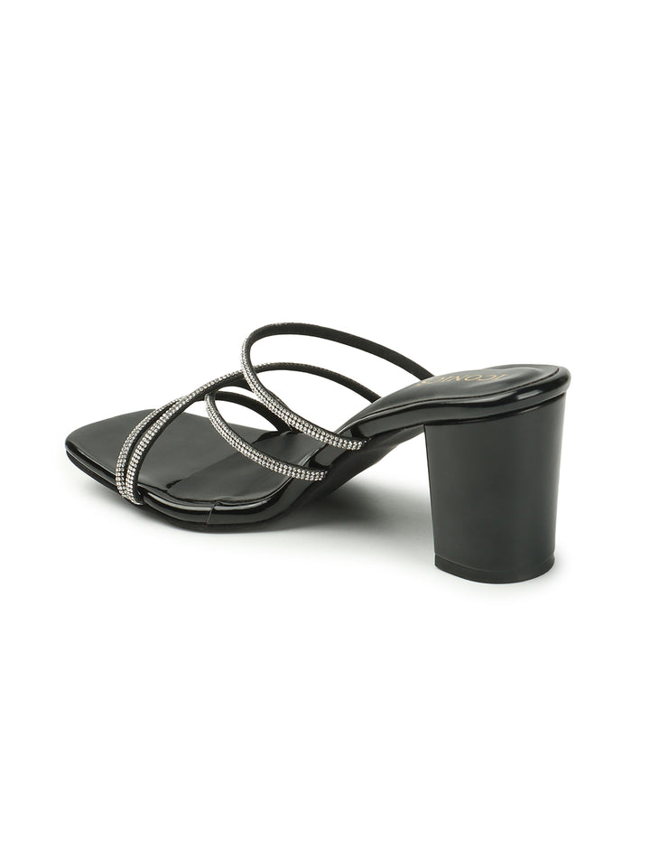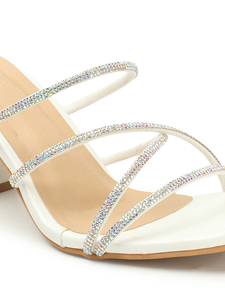 Make a dazzling entrance with these glamorous block heel sandals. Designed for effortless style, this slip-on silhouette features a set of multiple thin straps beautifully embellished with shimmering rhinestone detailing that catches the light with every step. Grounded by a sturdy, high chunky block heel, they provide stability and comfortable height, while the trendy open square toe adds a modern touch. These dazzling sandals are the perfect party footwear, instantly elevating your look for evening events, clubs, or any special occasion where sparkle is a must-have.