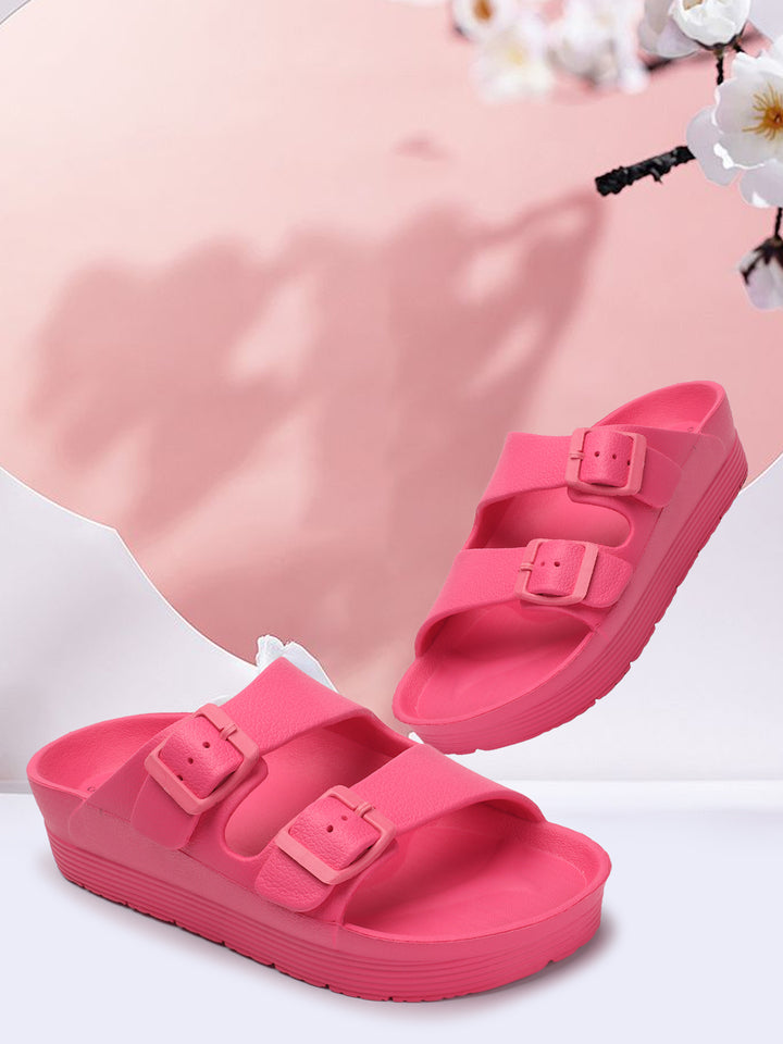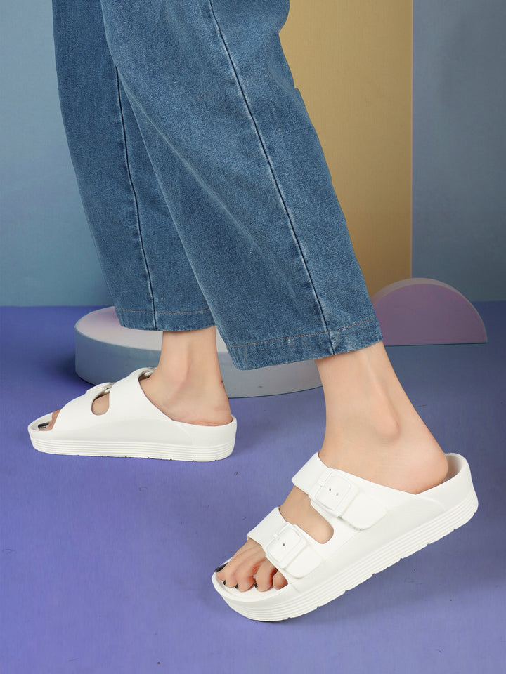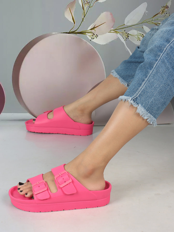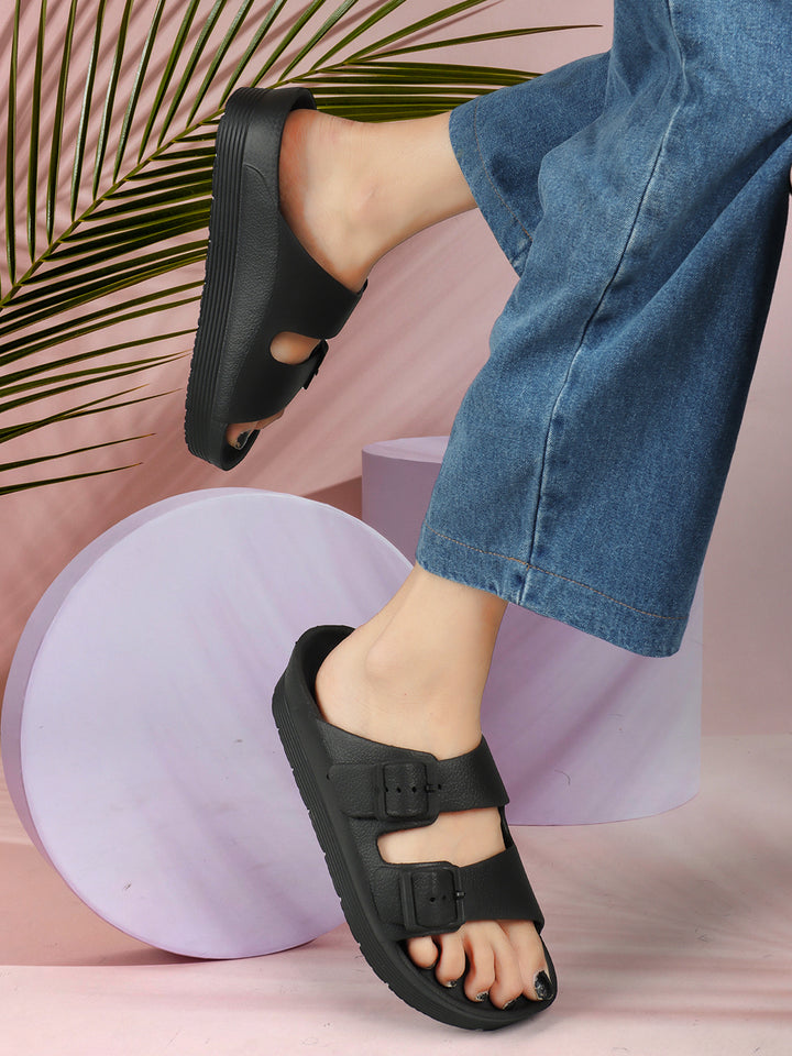 Step into sparkling style and comfort with these Women's Solid Double Buckle Platform Slides Women's Designed for a fashionable yet relaxed look, these footwear The comfortable Perfect for warm weather, these versatile are ideal for casual outings, special events, or simply adding a touch to your everyday look.