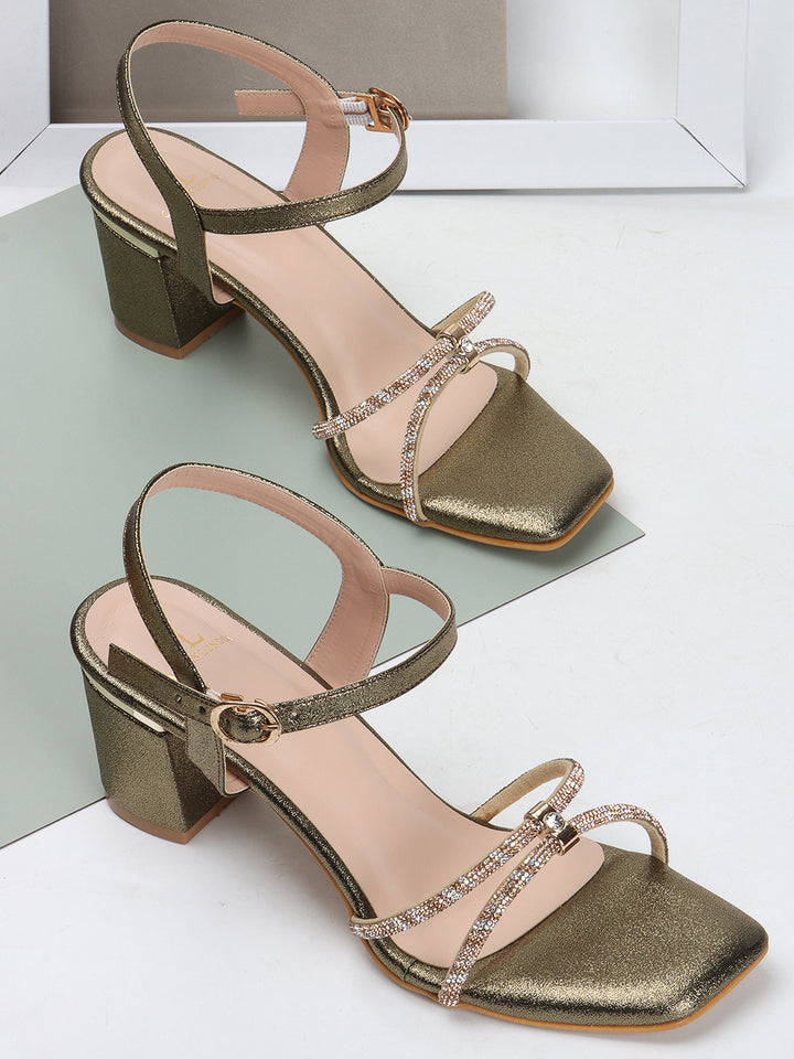 Women's Square Toe Embellished Ankle Strap Block Heel Sandals