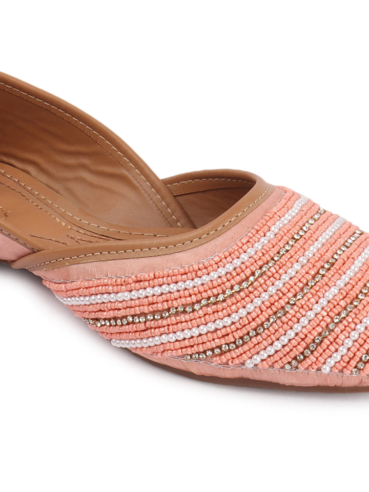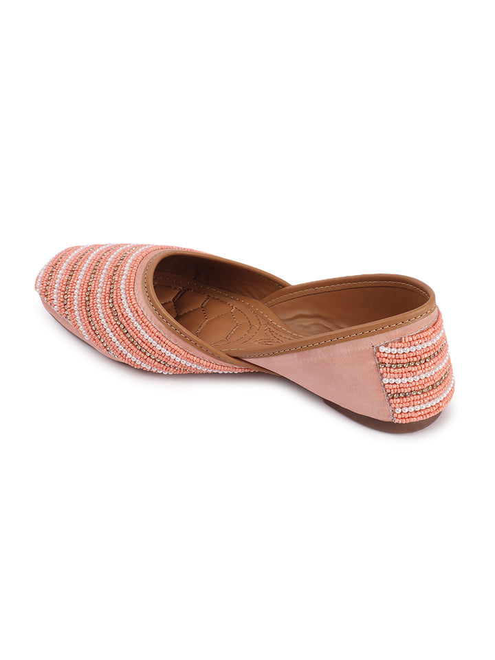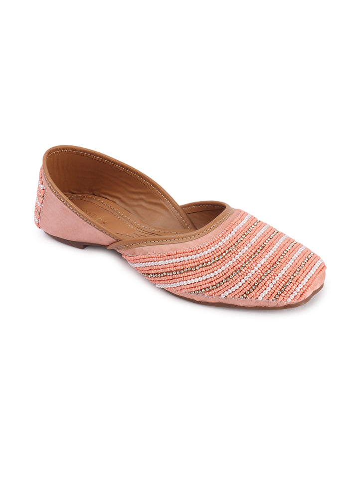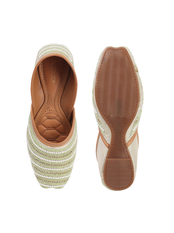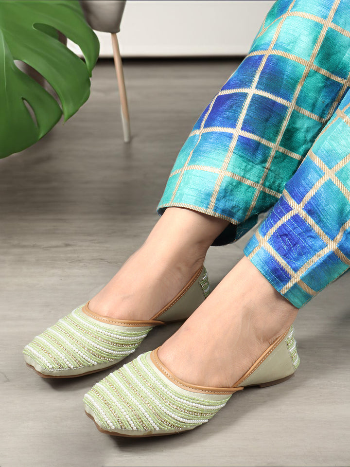 Infuse your ensemble with elegant texture and traditional charm with these beautiful hand-embellished flat juttis. The classic closed-toe design is adorned with a captivating pattern of delicate, alternating stripes of shimmering beads that create a sophisticated visual appeal across the vamp. Crafted on a comfortable flat sole and finished with soft inner lining, these artisanal flats offer both exceptional style and all-day comfort. They are the perfect accessory to add a touch of handcrafted artistry to ethnic wear, fusion outfits, or even to elevate a chic casual look, suitable for festivals, celebrations, or daily elegance.