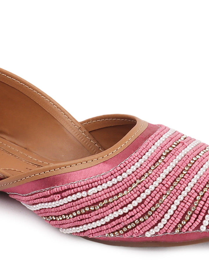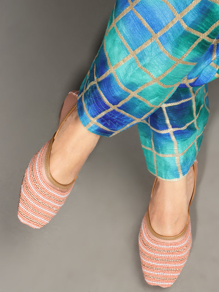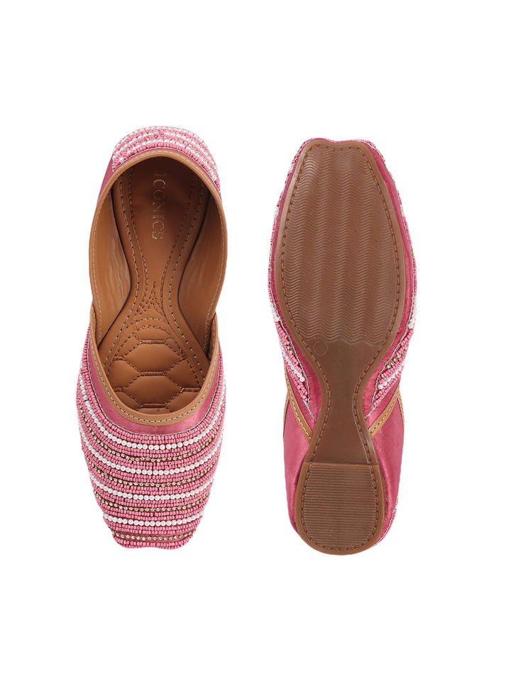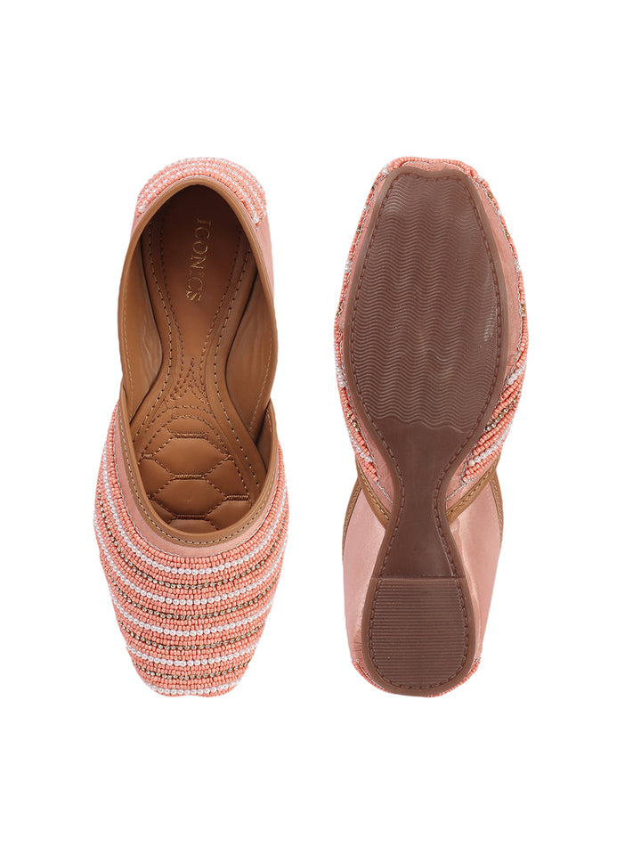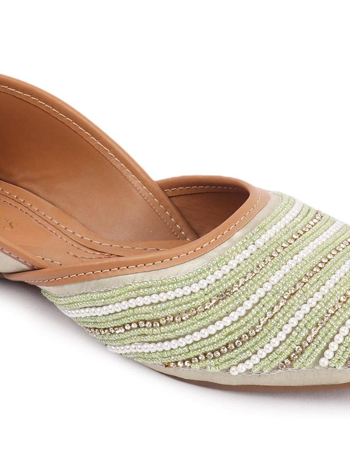 Infuse your ensemble with elegant texture and traditional charm with these beautiful hand-embellished flat juttis. The classic closed-toe design is adorned with a captivating pattern of delicate, alternating stripes of shimmering beads that create a sophisticated visual appeal across the vamp. Crafted on a comfortable flat sole and finished with soft inner lining, these artisanal flats offer both exceptional style and all-day comfort. They are the perfect accessory to add a touch of handcrafted artistry to ethnic wear, fusion outfits, or even to elevate a chic casual look, suitable for festivals, celebrations, or daily elegance.