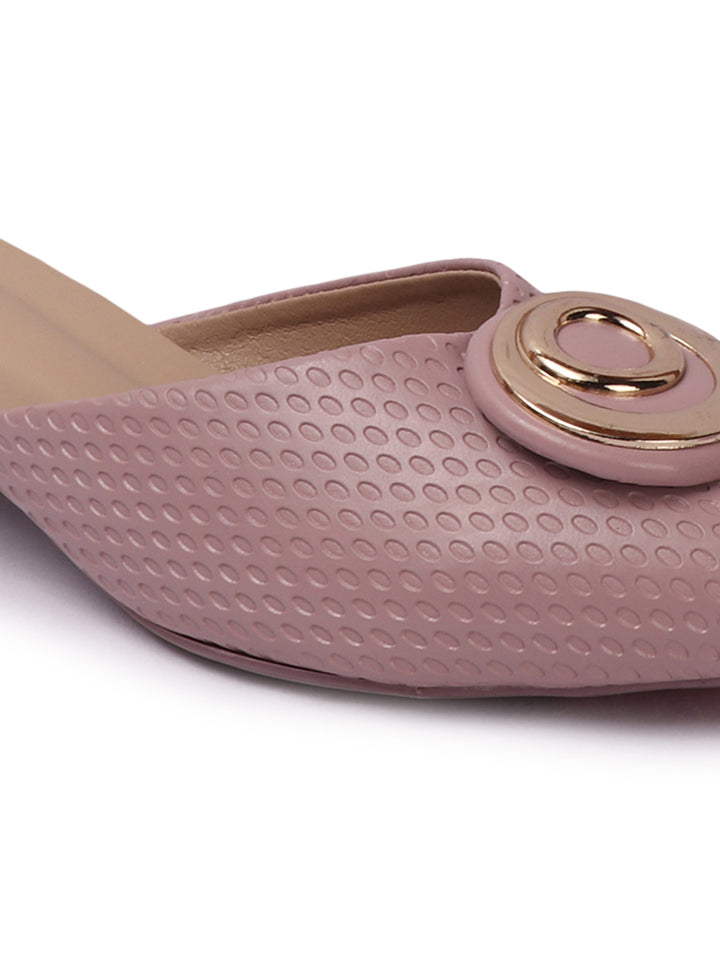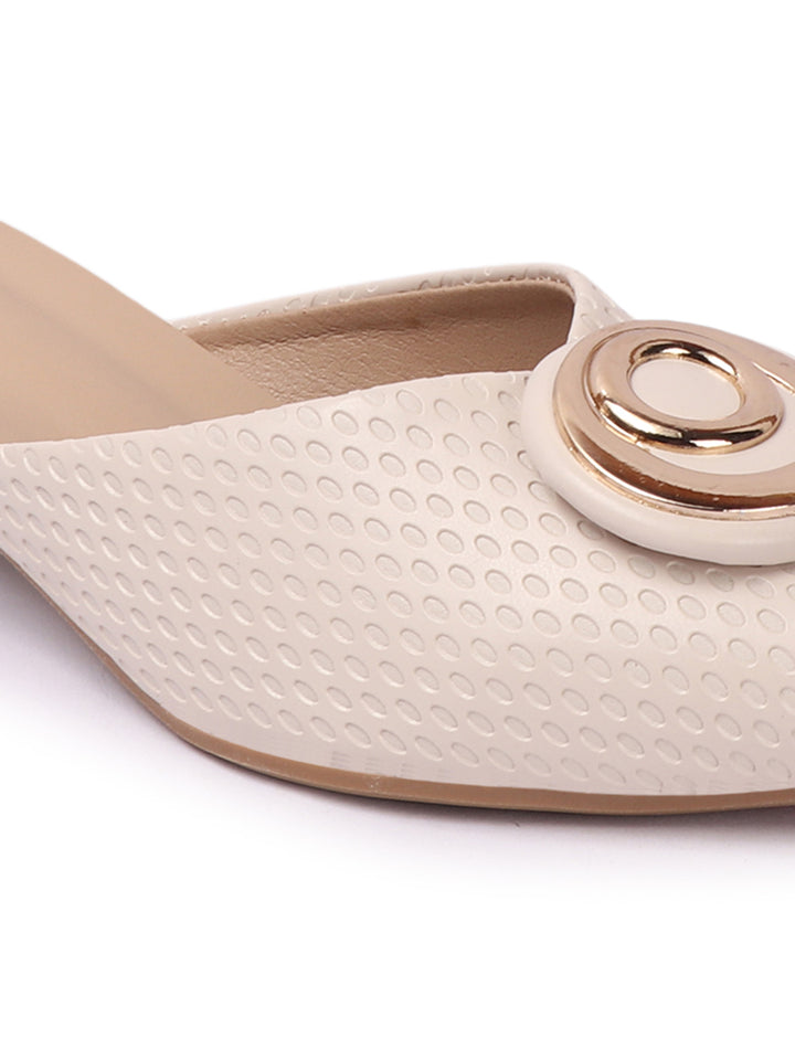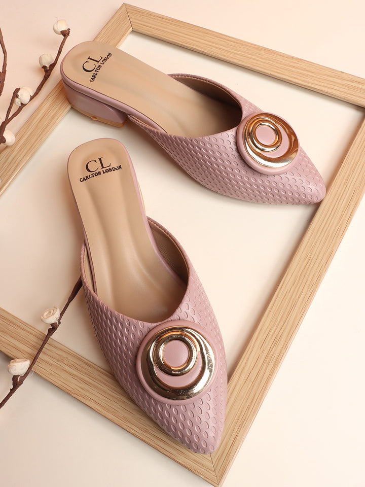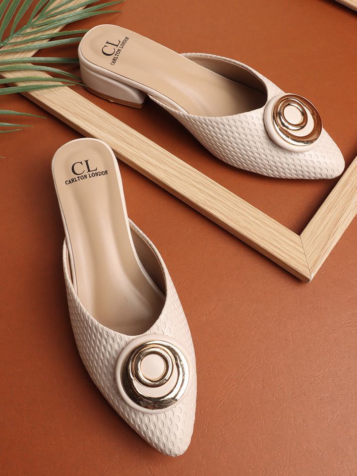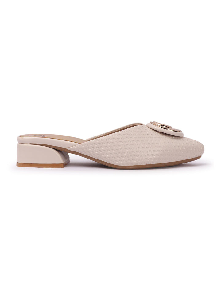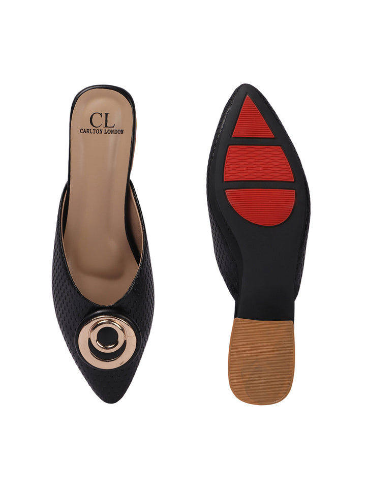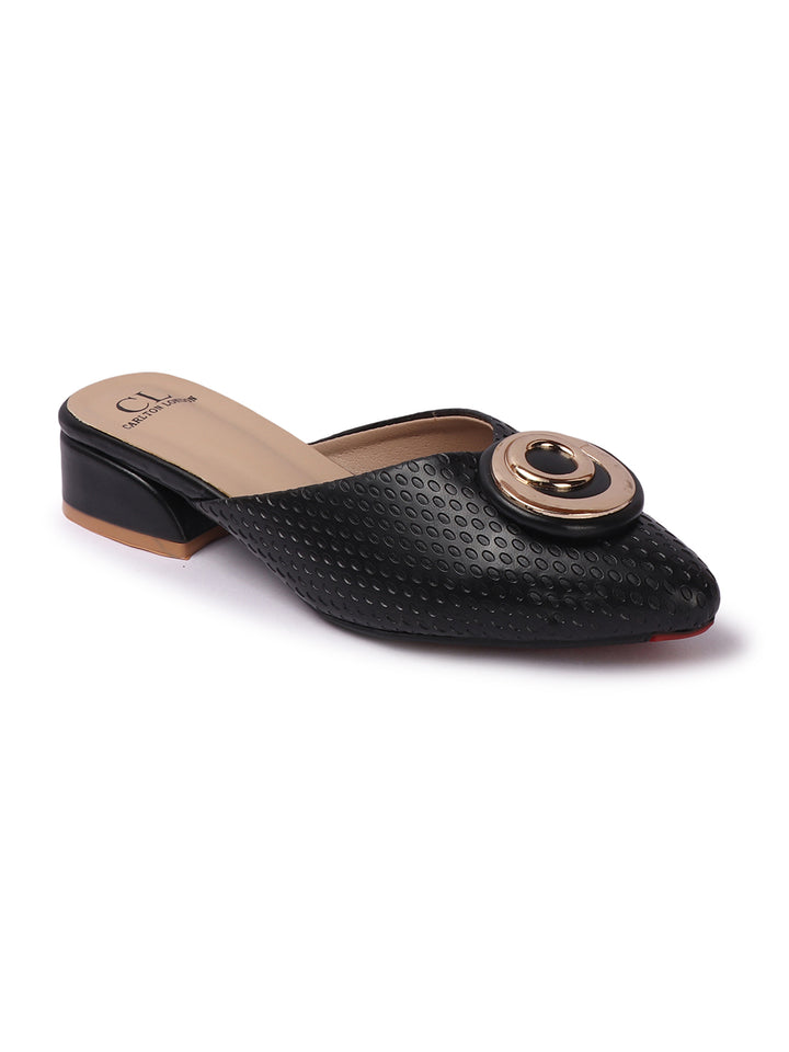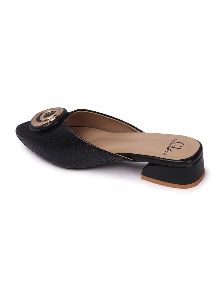 Women's Textured Block Heel Mules with Circular Ornament