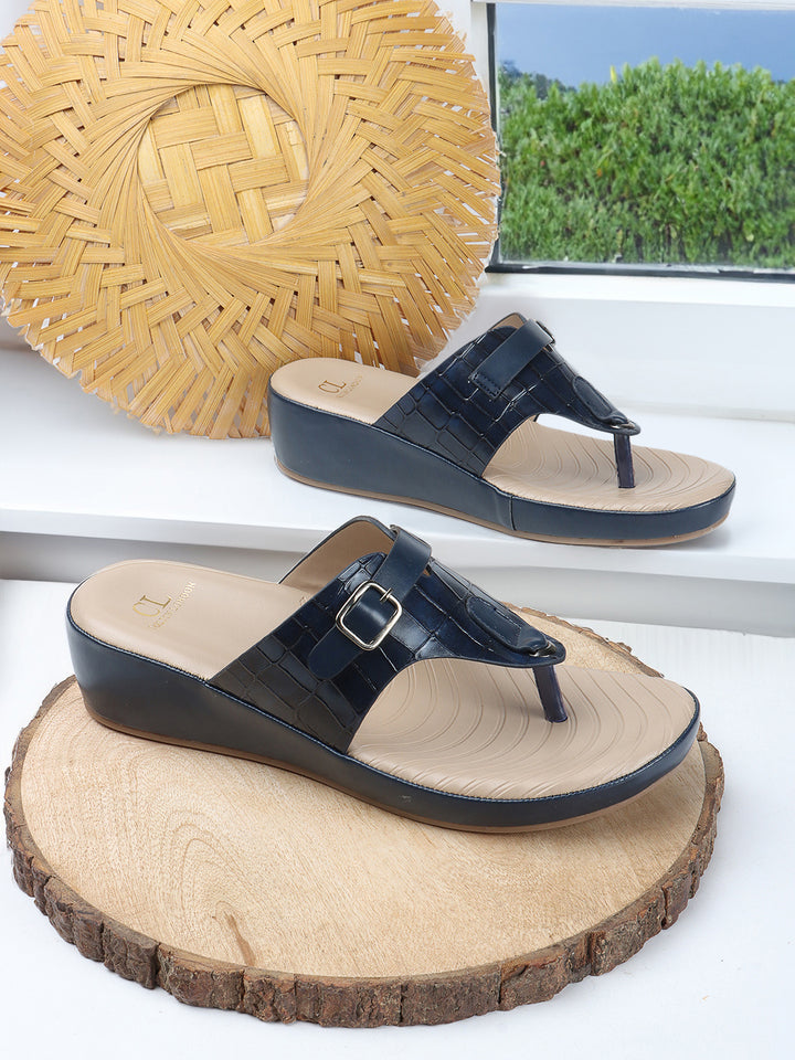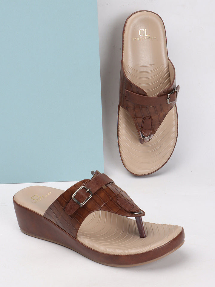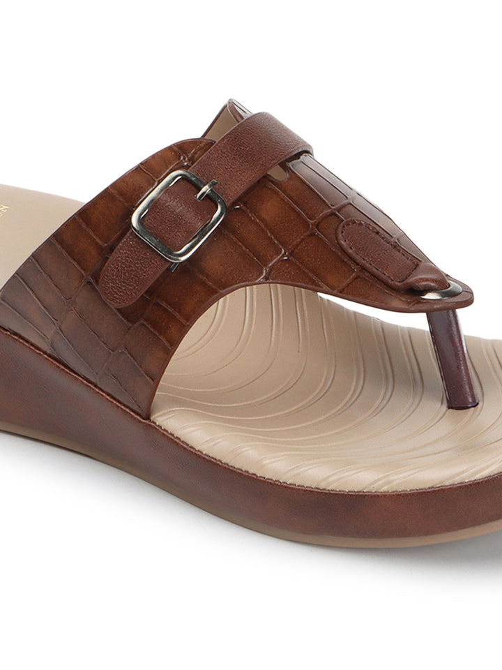 Women's Textured Buckle Detail Thong Wedge Sandals